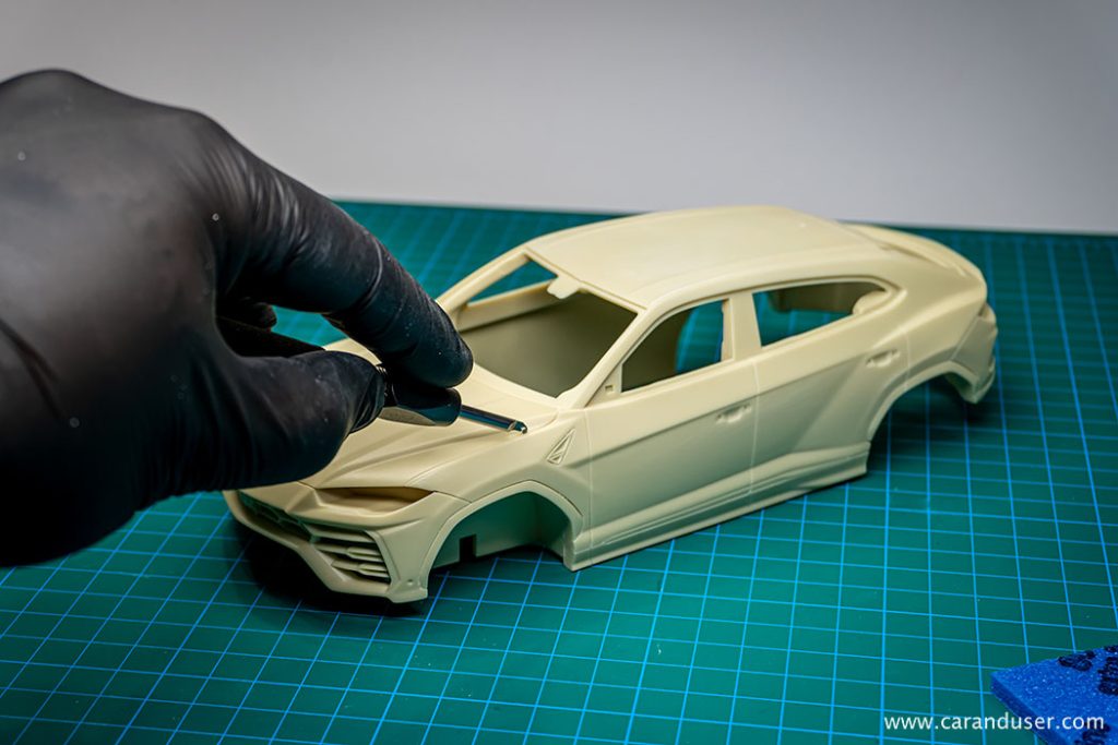 Če smo do sedaj uporabljali pripomočke, ki jih najdemo v vsakem lokalnem marketu, pa bomo od tu dalje uporabili posebne pripomočke namenjene maketarjem in avtoličarjem. Kljub temu, da pri Alpha Model vse kanale med paneli skrbno načrtujejo in jih kot eni redkih proizvajalci maket tudi ločujejo po debelini med gibljivi in negibljivimi deli karoserije, jih je potrebno malenkost poglobiti. Temu koraku se lahko manj izkušeni izdelovalci maket izognejo, vendar lahko to pomeni izginotje nekaterih kanalov med barvanjem in kasneje nezmožnost senčenja le-teh kar malce zmanjša realen videz končane makete.