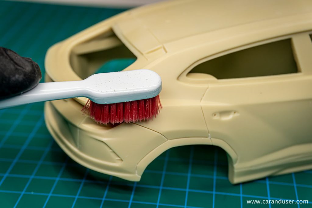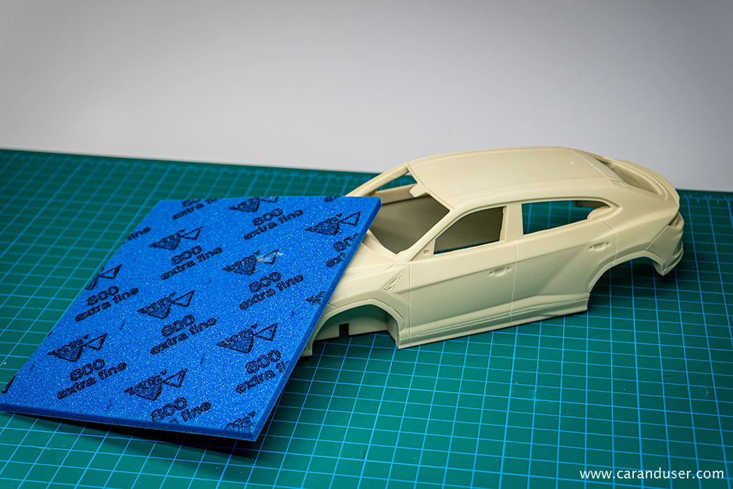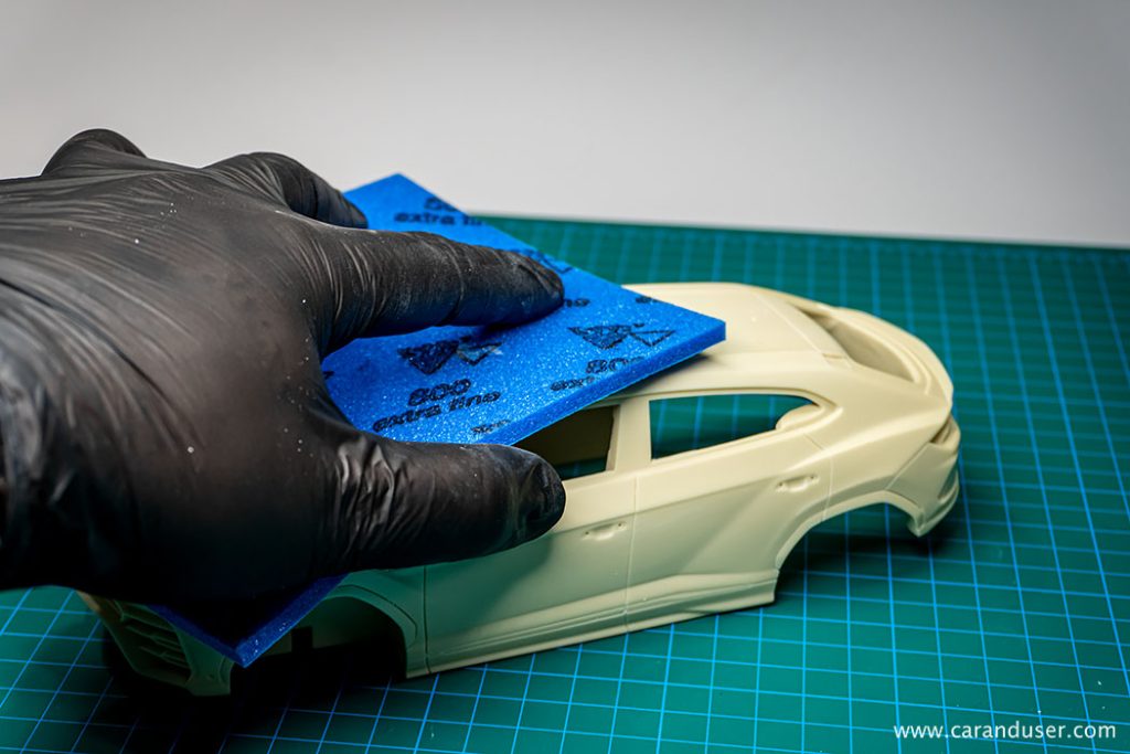 Tokrat gre za brusilno gobico. Uporabimo dokaj grobo gobico granulacije 800 in z njo pobrusimo celotno površino makete. Pri tem postopku posebno pozornost namenimo pregibom na karoseriji in skrbno pobrusimo vse, tudi skrite površine.