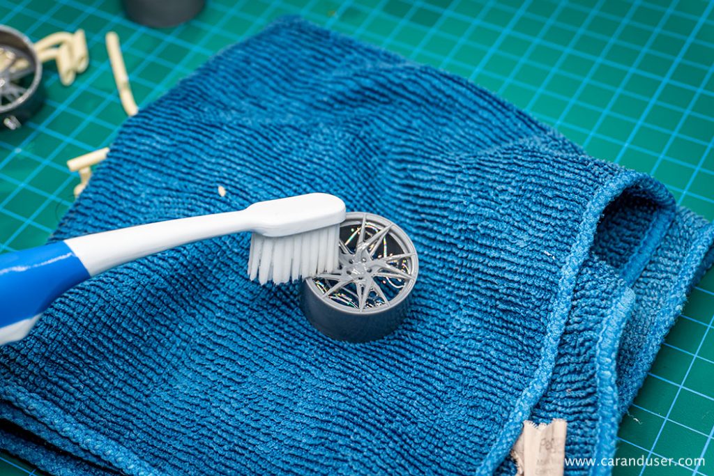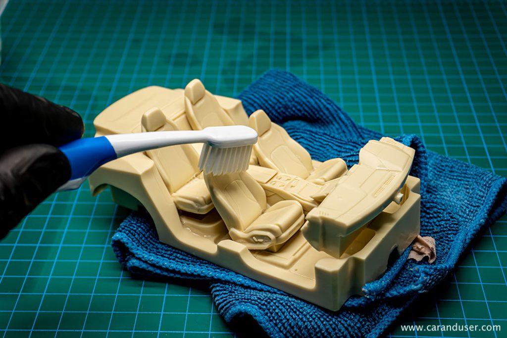 Z namenom zagotavljanja dobre, in predvsem oprijemljive podlage za nanašanje posebne barve, vse resinske dele našega Urusa namočimo v vodo, ki smo ji dodali nekaj kapljic čistila za posodo. Prav to čistilo ima odlično lastnost topljenja maščob in silikonov, ki bi lahko ostali na površini delov za narave ulivanja in odstranjevanja odlitkov iz orodij. Da zagotovimo, da se silikoni ne skrijejo v kanale med paneli, jih skrbno zdrgnemo s ščetko za zobe, vse tako očiščene dele pa postavimo na krpo iz mikro vlaken ter jih pustimo, da se odvečna tekočina vpije v krpo.
