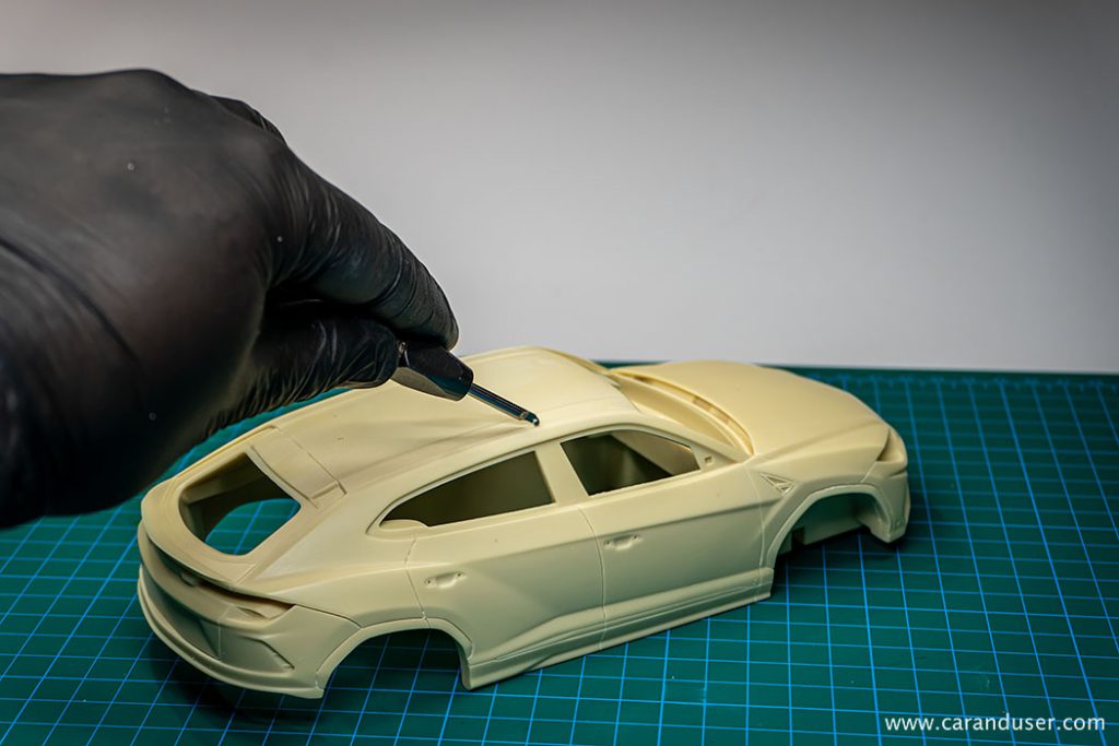 Če smo do sedaj uporabljali pripomočke, ki jih najdemo v vsakem lokalnem marketu, pa bomo od tu dalje uporabili posebne pripomočke namenjene maketarjem in avtoličarjem. Kljub temu, da pri Alpha Model vse kanale med paneli skrbno načrtujejo in jih kot eni redkih proizvajalci maket tudi ločujejo po debelini med gibljivi in negibljivimi deli karoserije, jih je potrebno malenkost poglobiti. Temu koraku se lahko manj izkušeni izdelovalci maket izognejo, vendar lahko to pomeni izginotje nekaterih kanalov med barvanjem in kasneje nezmožnost senčenja le-teh kar malce zmanjša realen videz končane makete.