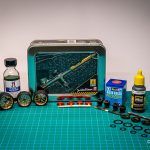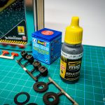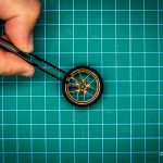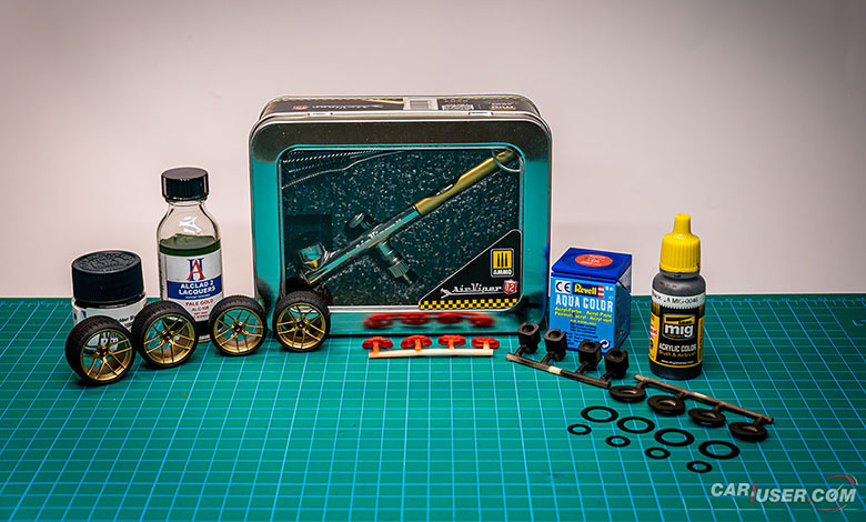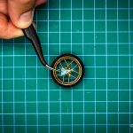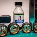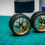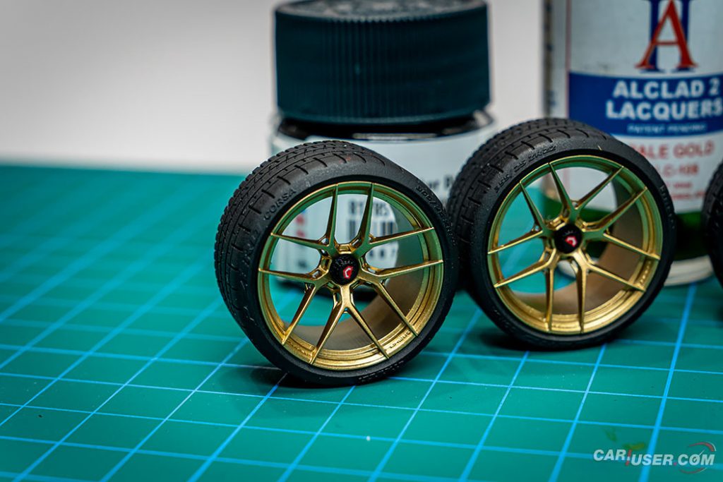 Sama platišča in pnevmatike so izdelane s pomočjo 3D tiska in so tako že pripravljena na barvanje. Pirellijeve pnevmatike smo odeli v Tamiyino XF-85 barvo, ki je posebej razvita za ponazarjanje pnevmatik, platišča pa smo pobarvali v Pale Gold odtenek Alcladeve posebne kovinske barve, ki so nam jo priskrbeli pri miniatures.si.