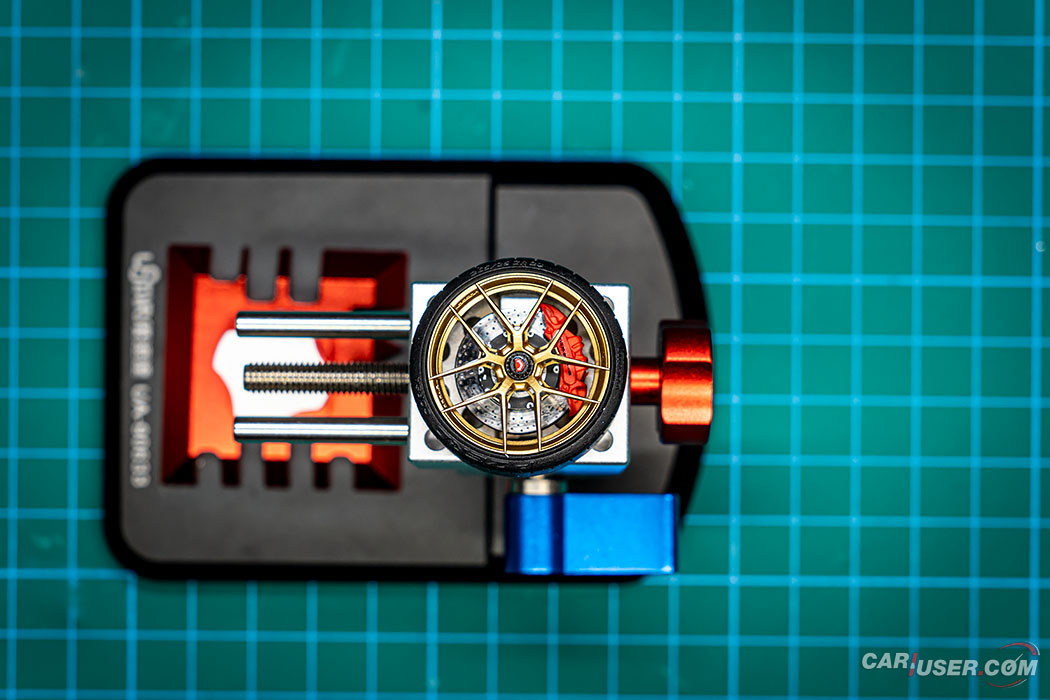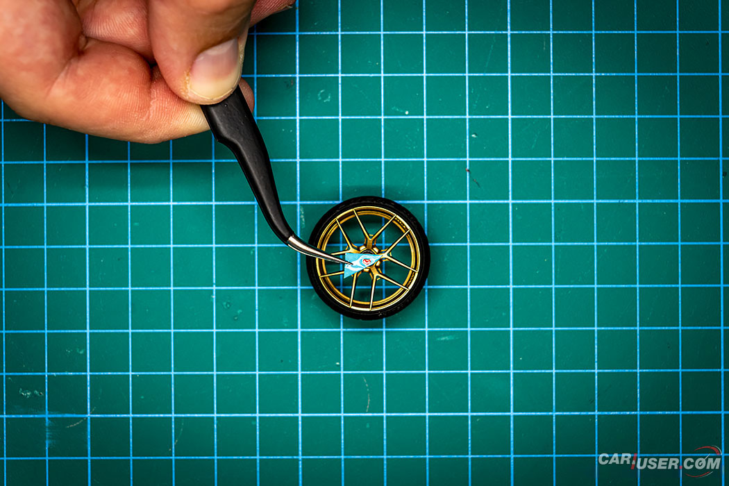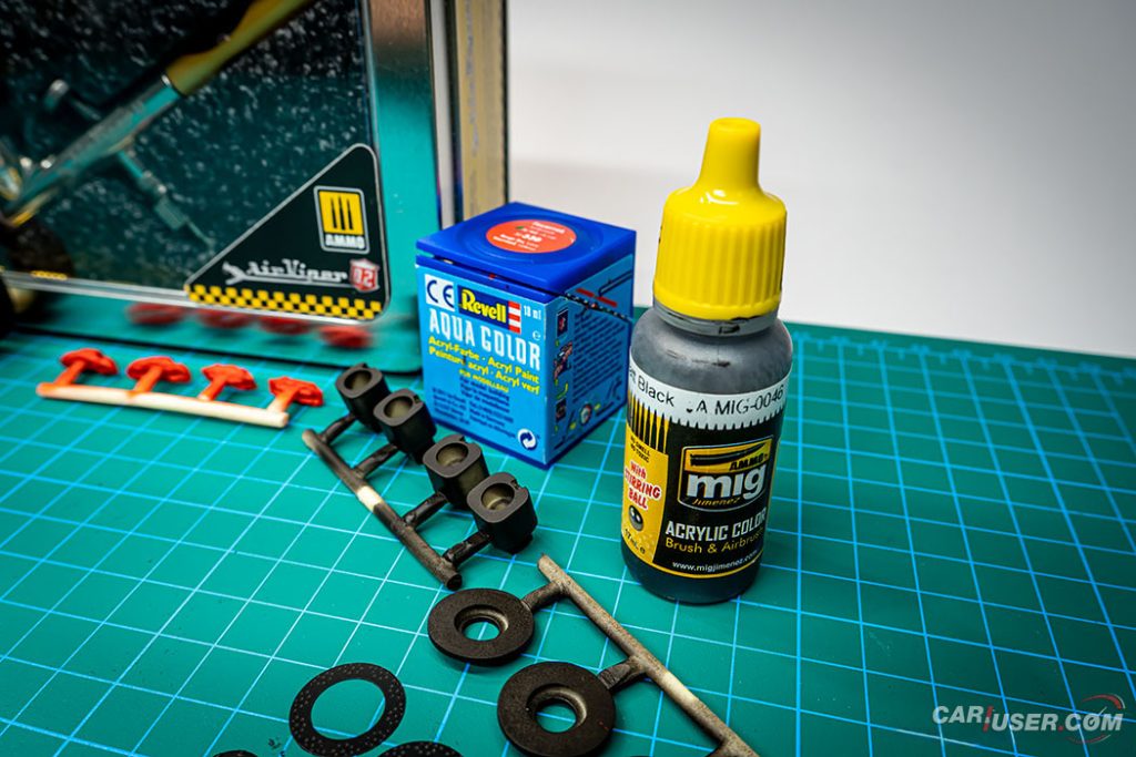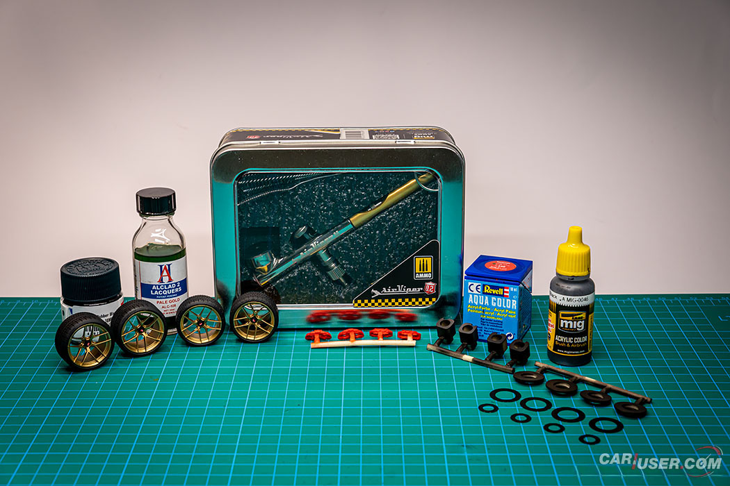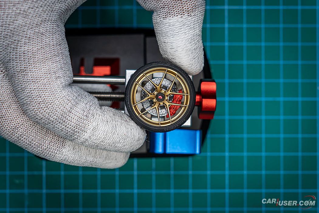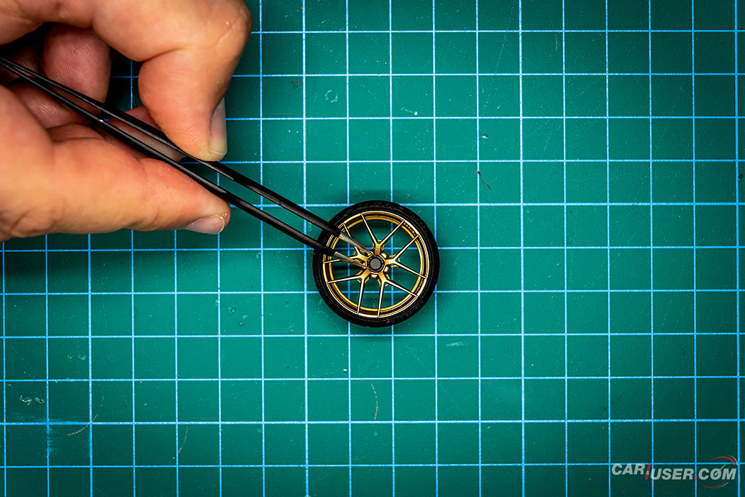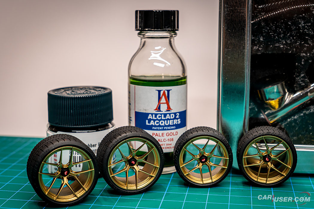 Sama platišča in pnevmatike so izdelane s pomočjo 3D tiska in so tako že pripravljena na barvanje. Pirellijeve pnevmatike smo odeli v Tamiyino XF-85 barvo, ki je posebej razvita za ponazarjanje pnevmatik, platišča pa smo pobarvali v Pale Gold odtenek Alcladeve posebne kovinske barve, ki so nam jo priskrbeli pri miniatures.si.