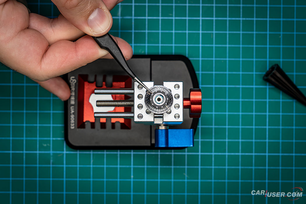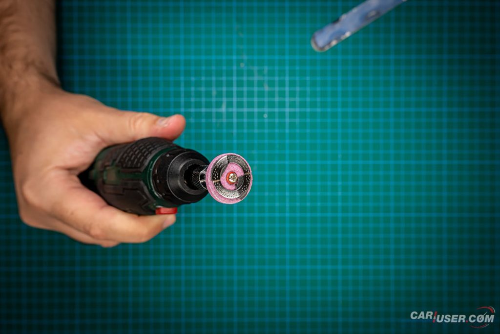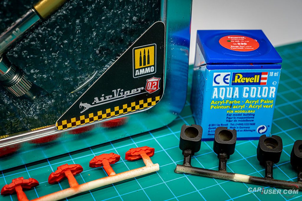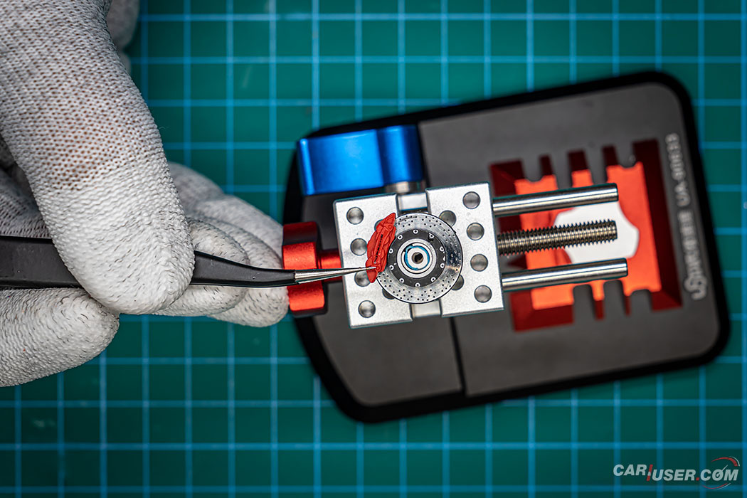 Da bomo lahko pnevmatike in platišča namestili na našo maketo, smo v mat črno barvo odeli bloke, kamor bodo nameščene zavore in kasneje kolesa, zavorne čeljusti pa smo tokrat pobarvali v živo rdečo barvo. Pri Porscheju živo rdeča barva zavornih čeljusti pomeni, da so koluti izdelani iz kovine in ne karbona, zato smo kovinske obloge zavornih diskov zgolj ustrezno pobrusili in jim s tem zagotovili prepričljivejši izgled ter poseben kovinski sijaj.