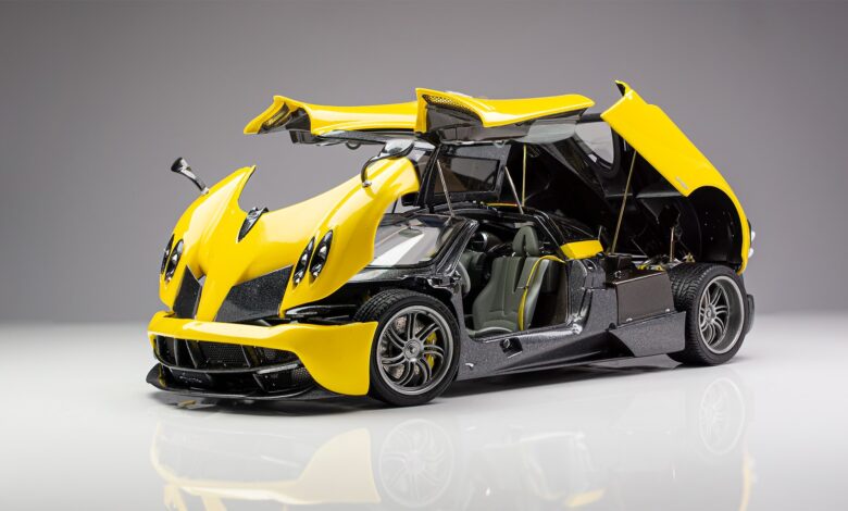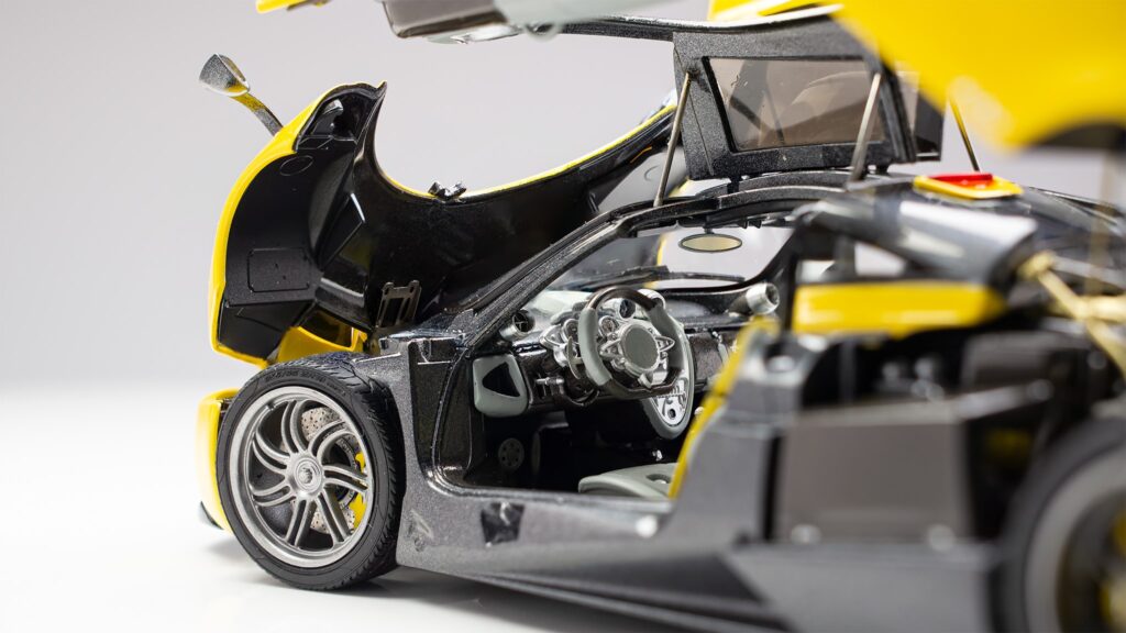 Kot se za maketo enega najbolj detajliranih avtomobilov spodobi, je tudi tu že osnovni kit izvrstno dodelan in omogoča odpiranje vrat, motornega pokrova ter sprednjega dela avtomobila, kjer se nahajajo hladilniki in sprednje vzmetenje. Glede na unikatnost vsake prave Huayre, je tudi maketa narejena po edinstvenih specifikacijah. Za barvo karoserije sta uporabljeni avtomobilski barvi narejeni po recepturi Aston Martina, perla rumena barva je dvokomponentna Sunburts yellow barva, siva pa je Quantum grey. Ostale uporabljene barve so tokrat Tamiyine akrilne barve različnih odtenkov, za ponazoritev kovinskih delov pa so uporabljene izvrstne, a za uporabo zelo zahtevne barve proizvajalca Alclad.