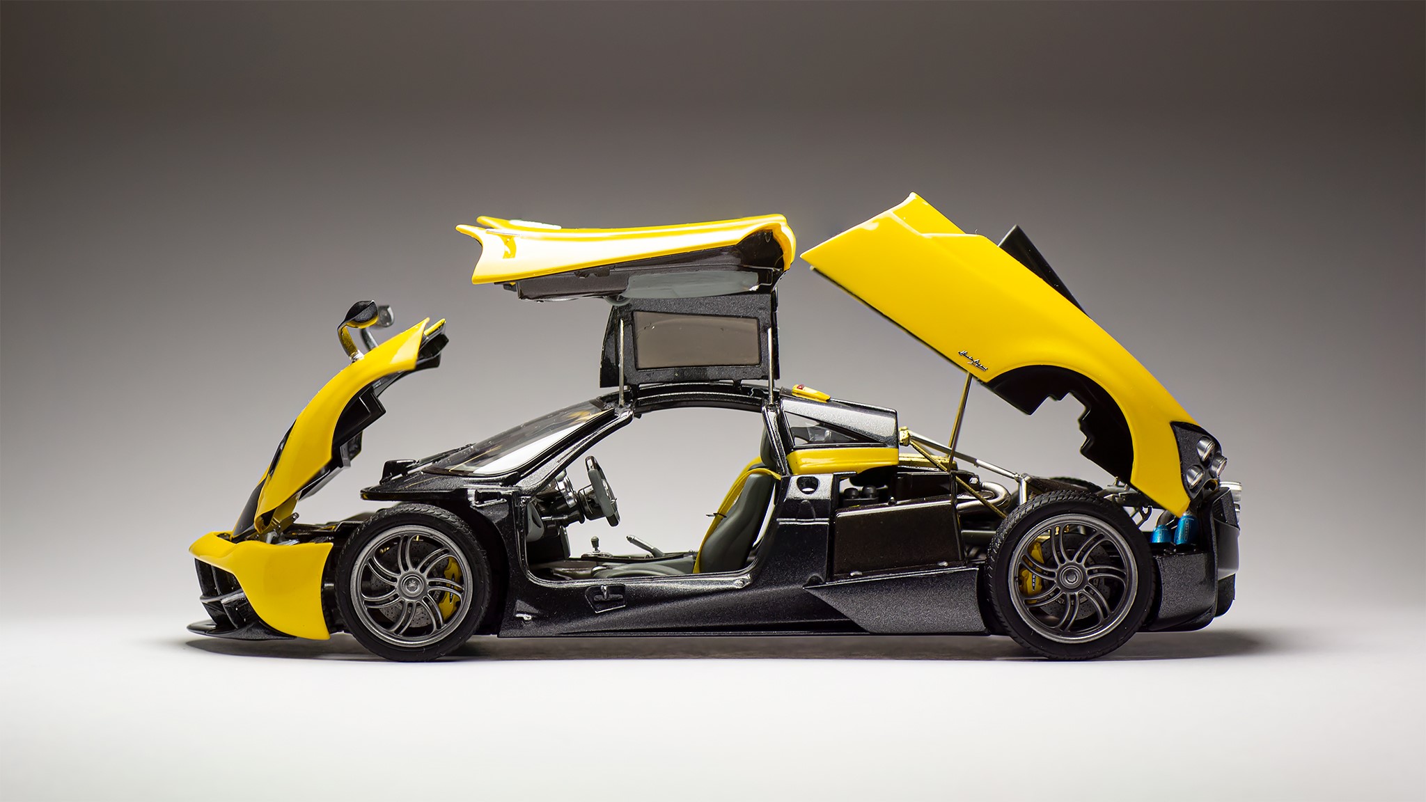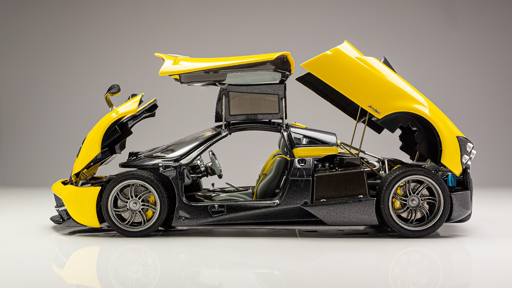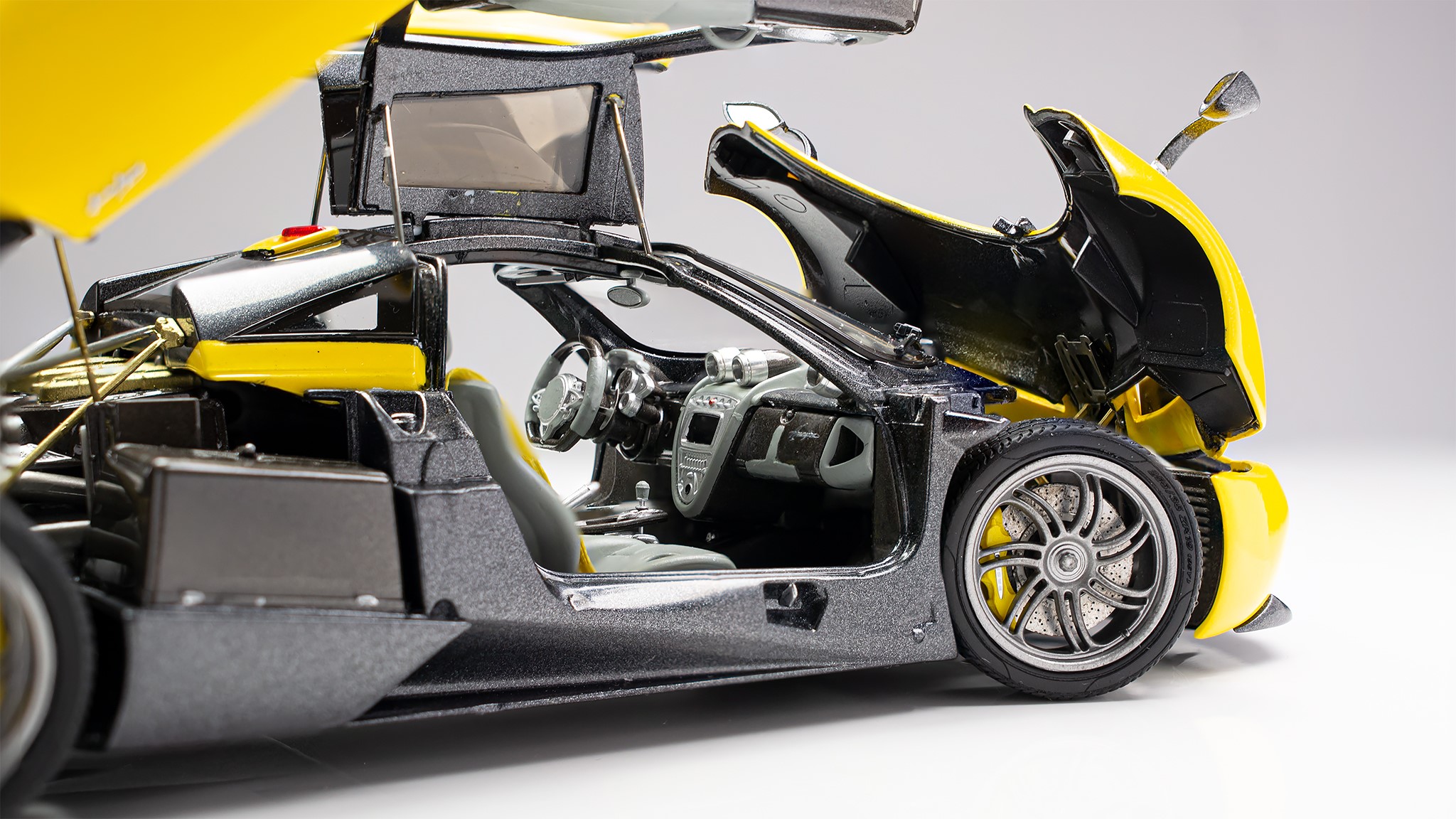 Kot se za maketo enega najbolj detajliranih avtomobilov spodobi, je tudi tu že osnovni kit izvrstno dodelan in omogoča odpiranje vrat, motornega pokrova ter sprednjega dela avtomobila, kjer se nahajajo hladilniki in sprednje vzmetenje. Glede na unikatnost vsake prave Huayre, je tudi maketa narejena po edinstvenih specifikacijah. Za barvo karoserije sta uporabljeni avtomobilski barvi narejeni po recepturi Aston Martina, perla rumena barva je dvokomponentna Sunburts yellow barva, siva pa je Quantum grey. Ostale uporabljene barve so tokrat Tamiyine akrilne barve različnih odtenkov, za ponazoritev kovinskih delov pa so uporabljene izvrstne, a za uporabo zelo zahtevne barve proizvajalca Alclad.