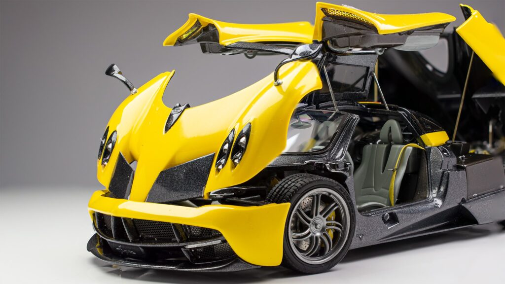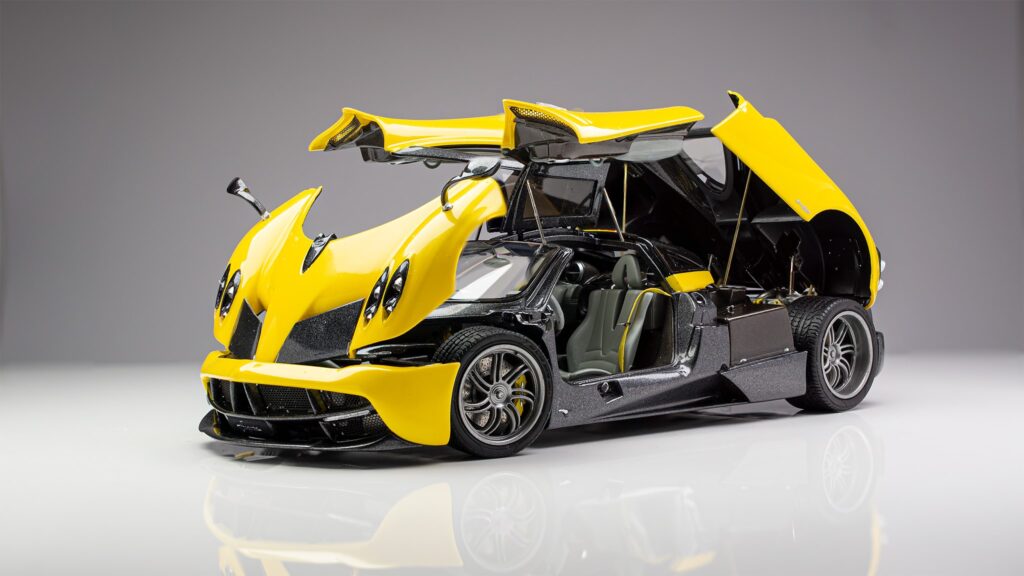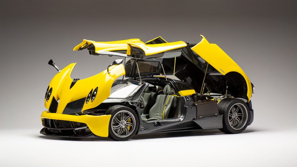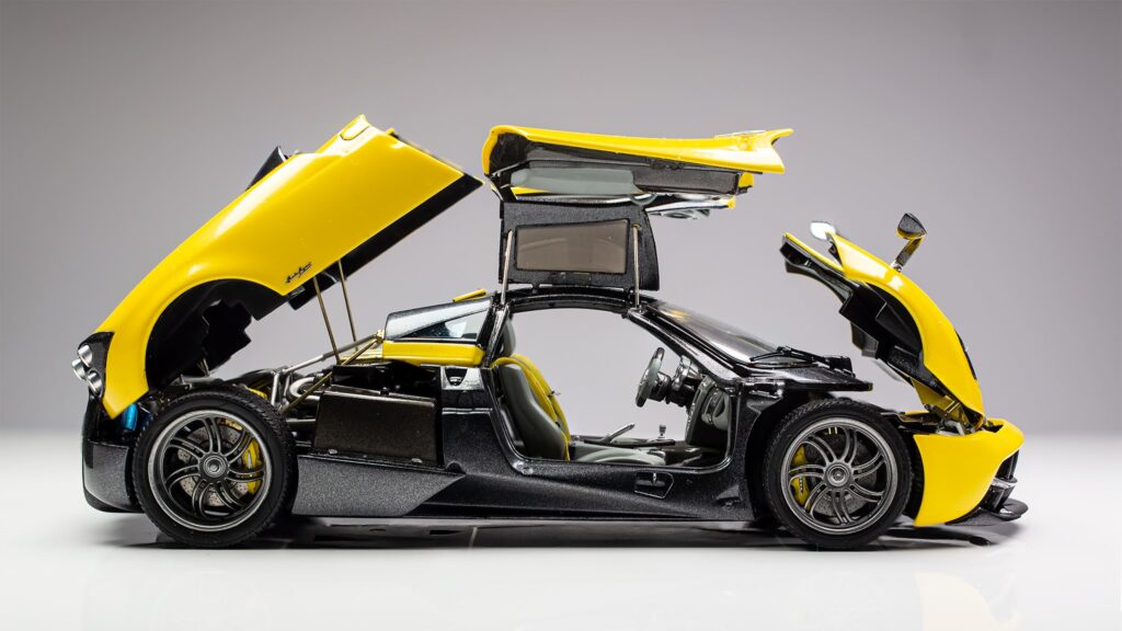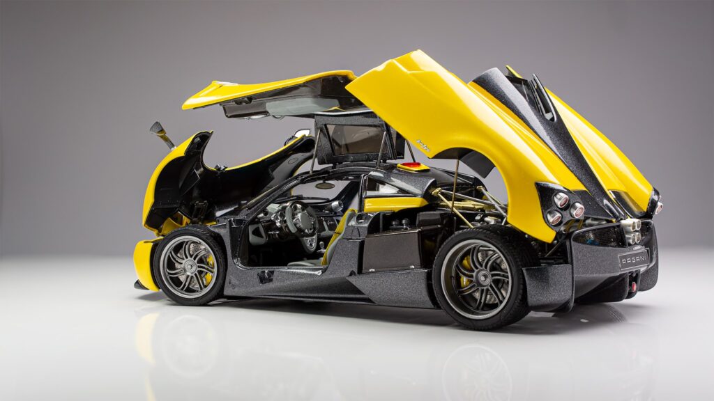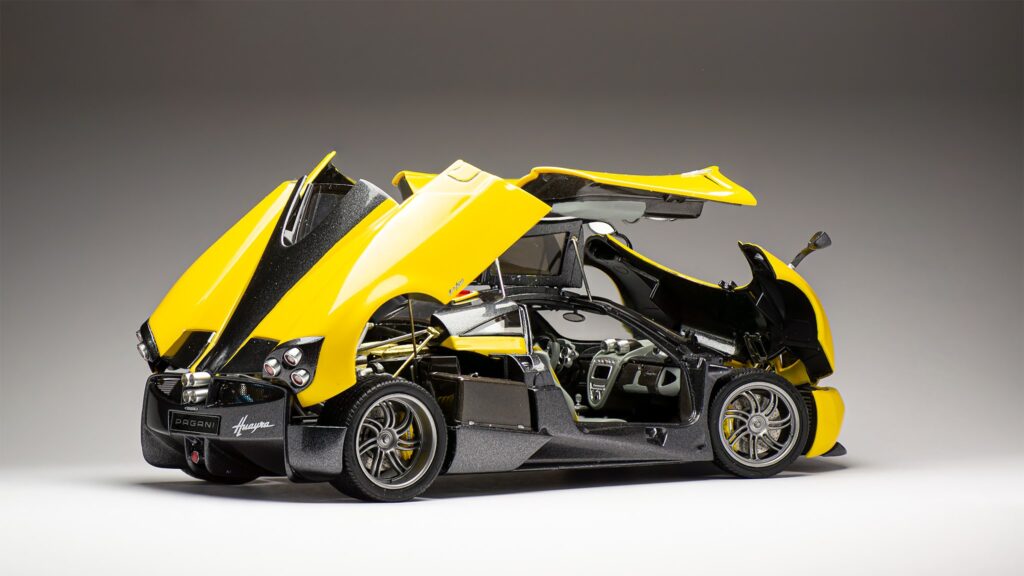 Kot se za maketo enega najbolj detajliranih avtomobilov spodobi, je tudi tu že osnovni kit izvrstno dodelan in omogoča odpiranje vrat, motornega pokrova ter sprednjega dela avtomobila, kjer se nahajajo hladilniki in sprednje vzmetenje. Glede na unikatnost vsake prave Huayre, je tudi maketa narejena po edinstvenih specifikacijah. Za barvo karoserije sta uporabljeni avtomobilski barvi narejeni po recepturi Aston Martina, perla rumena barva je dvokomponentna Sunburts yellow barva, siva pa je Quantum grey. Ostale uporabljene barve so tokrat Tamiyine akrilne barve različnih odtenkov, za ponazoritev kovinskih delov pa so uporabljene izvrstne, a za uporabo zelo zahtevne barve proizvajalca Alclad.