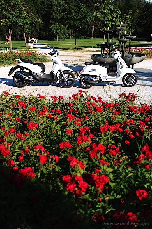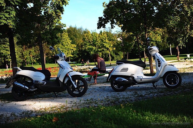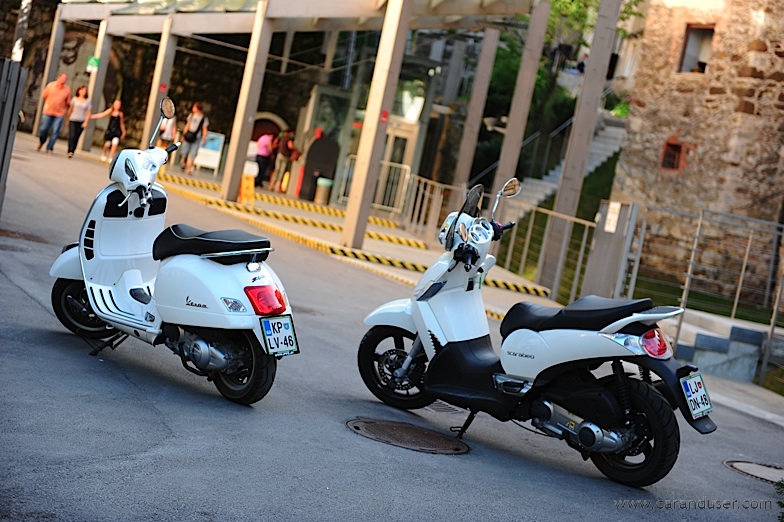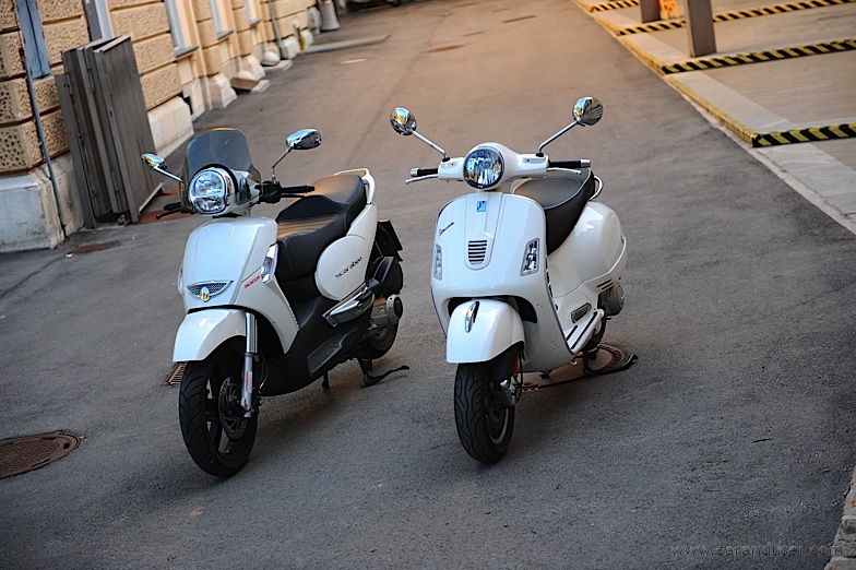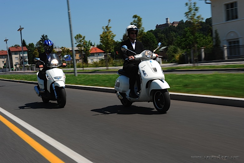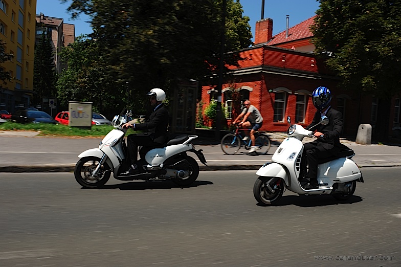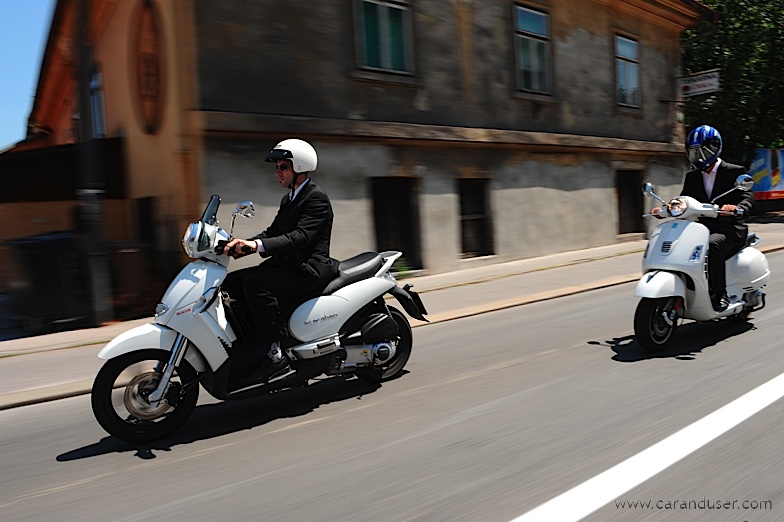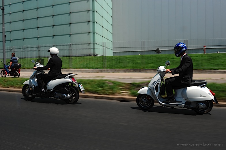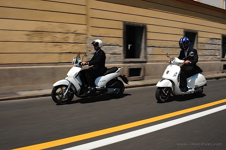 Vespa in Aprilia sta uslišali vaše misli. Lačnemu tržišču so ponudili dva urbana mestna skuterja, ki se obleke ne branita, obenem pa ponujata zadostno mero moči. Res zadostno? Moči je še preveč, saj se hitro lahko zgodi, da boste pri odprtem plinu izgubili za seboj sedečega Goat Riderja, ki ga je bilo v našem primeru treba, kot nepripravljenega, da ne rečemo nekoliko zasmehljivega, sopotnika na Vespi, loviti za spodnje okončine. Le malo je namreč manjkalo, da ni preveril kakovosti in trdote asfalta.