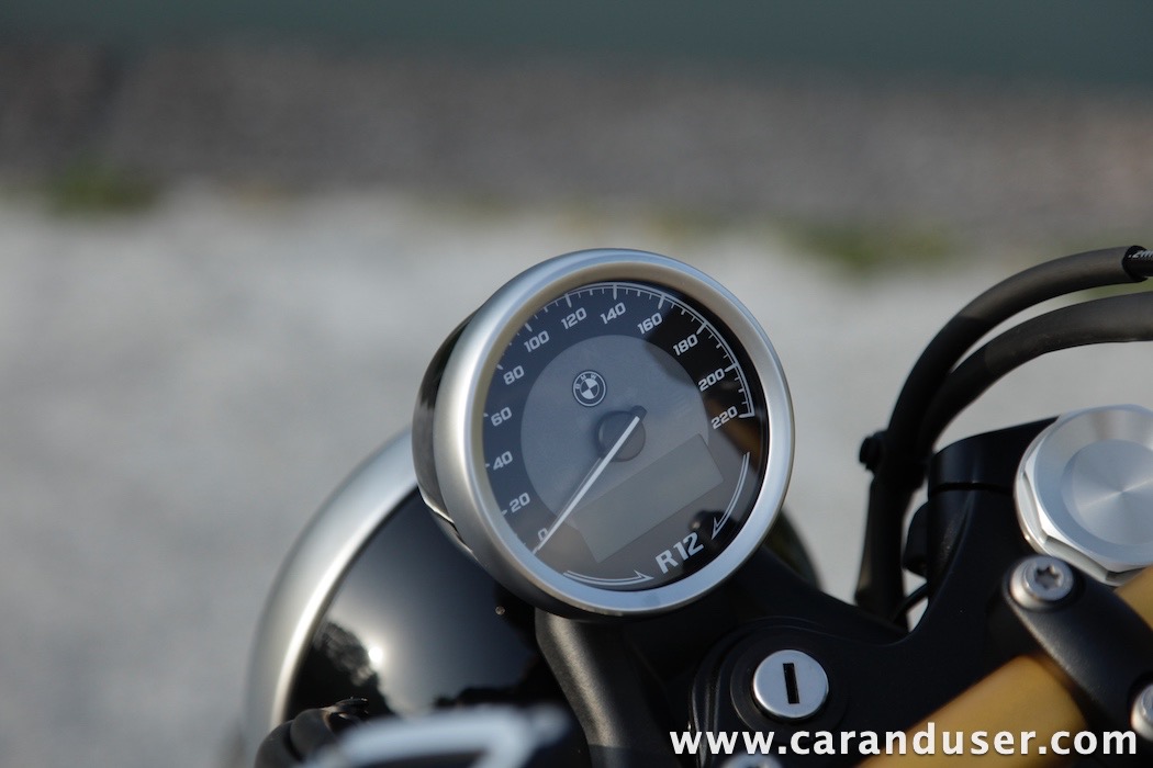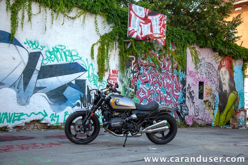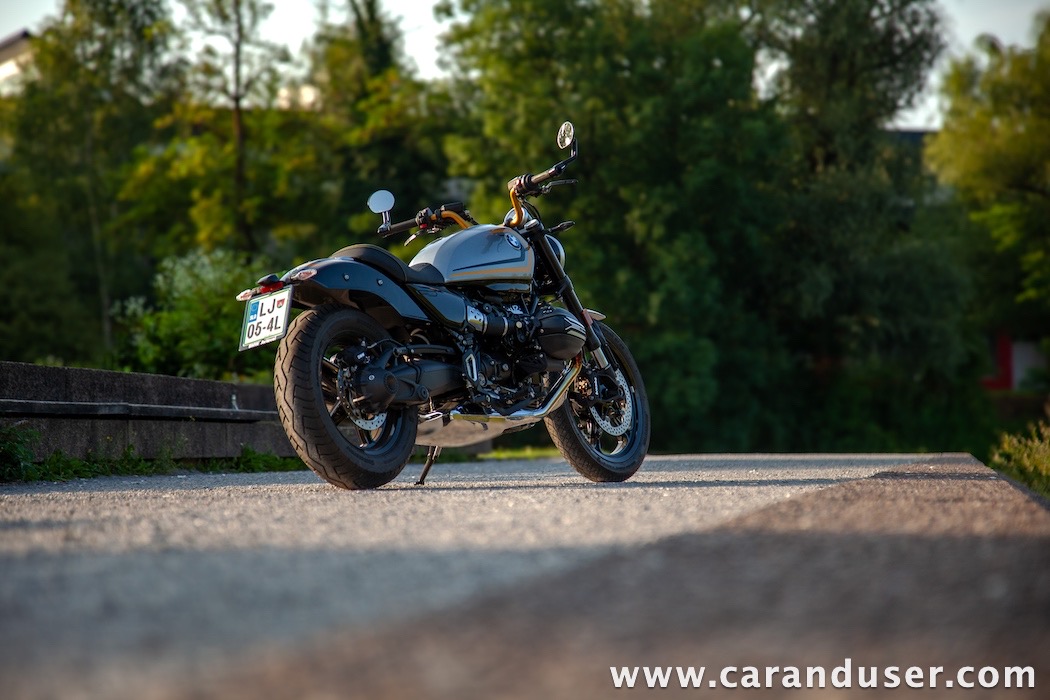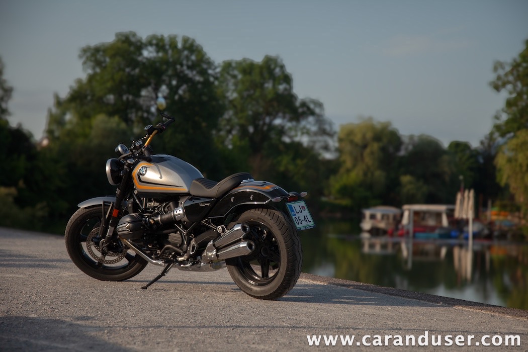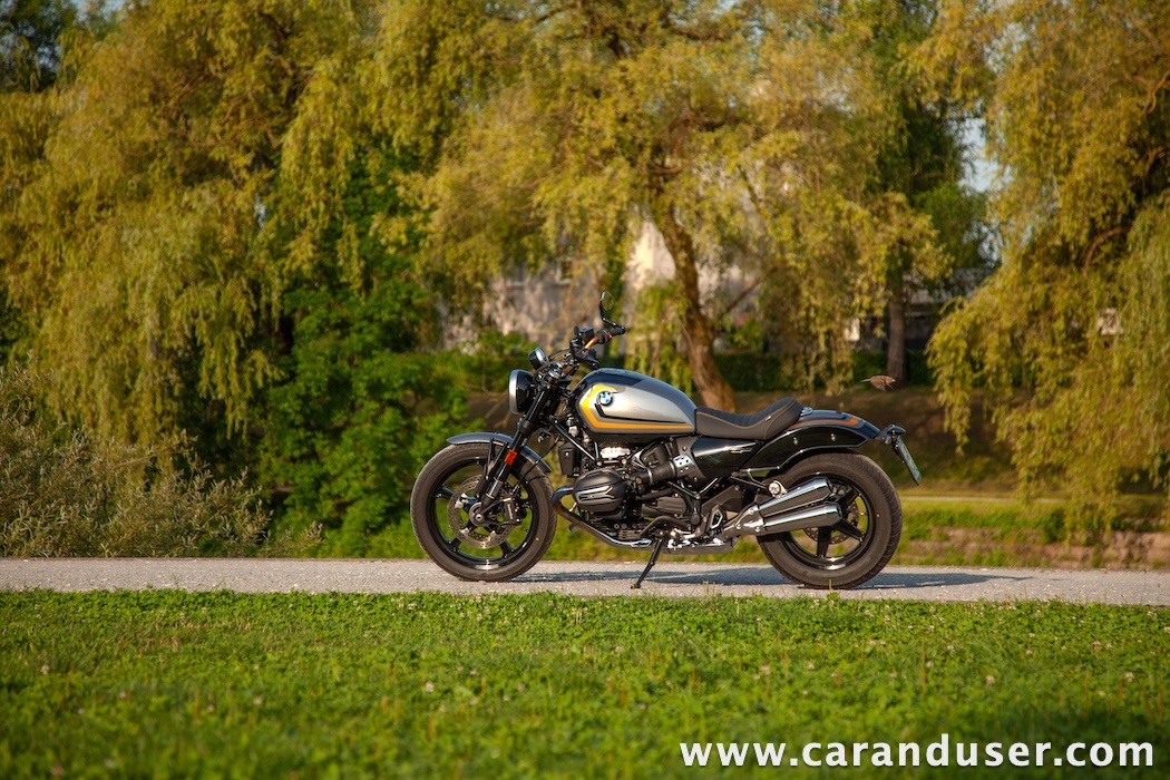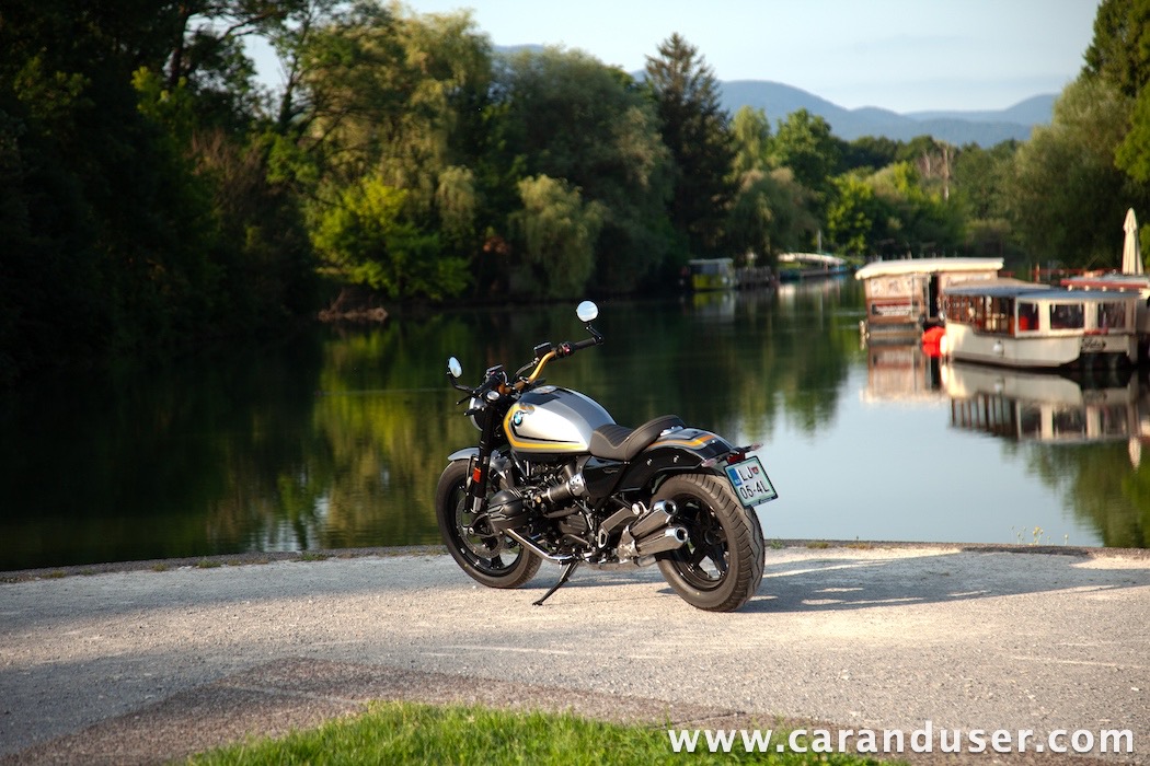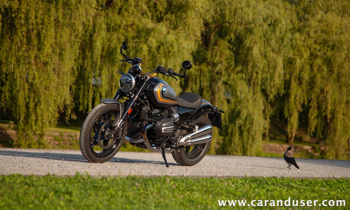 Tokrat smo preizkusil “osnovni” model – BMW R 12. V primerjavi z jubilejnim “najntijem” premore deset kilovatov šibkejšo konjušnico in 5 Nm navora manj. Posledično boste v eni uri pod polnim plinom prevozili sedem kilometrov krajšo pot. Prednja vilica ni nastavljiva, kompletno vzmetenje pa ima 30 mm manj hoda. Drugačne so pnevmatike, par milimetrov razlike pri medosju in dolžini, ter par kilogramov pri teži. R 12 premore jeklen rezervoar z dvema litroma manjšo prostornino. In eno motorno “mapo” manj. Nič kaj drastičnega.