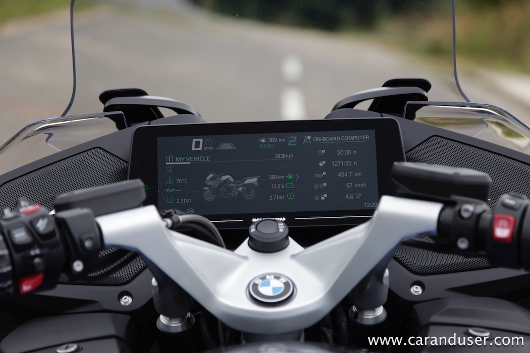 Izjemen je že pogled na armaturno ploščo, kjer kraljuje ogromen 10-palčni zaslon, ki združuje različne instrumente in dodatno omogoča dostop do praktičnih funkcij, kot so multimedija, navigacija in povezljivost. Testni motocikel je bil opremljen celo z radarskim tempomatom, ogrevanimi sedeži in pazi to – centralnim zaklepanjem prtljažnih kovčkov in shranjevalnih prostorov ter električnim pomikom vetrobranskega stekla. Vsa stikala so ergonomsko razporejena, po nekaj dneh sem zelo dobro vedel, s katerim stikalom upravljam katero funkcijo in kje je nameščeno, tako da je odvračanja pozornosti od ceste relativno malo, a po mojem mnenju vsekakor še vedno preveč. Preden se recimo dokoplješ do vklopa gretja ročic, lahko skoraj doktoriraš iz informatike. Zagotovo tega ne počnite med vožnjo.
