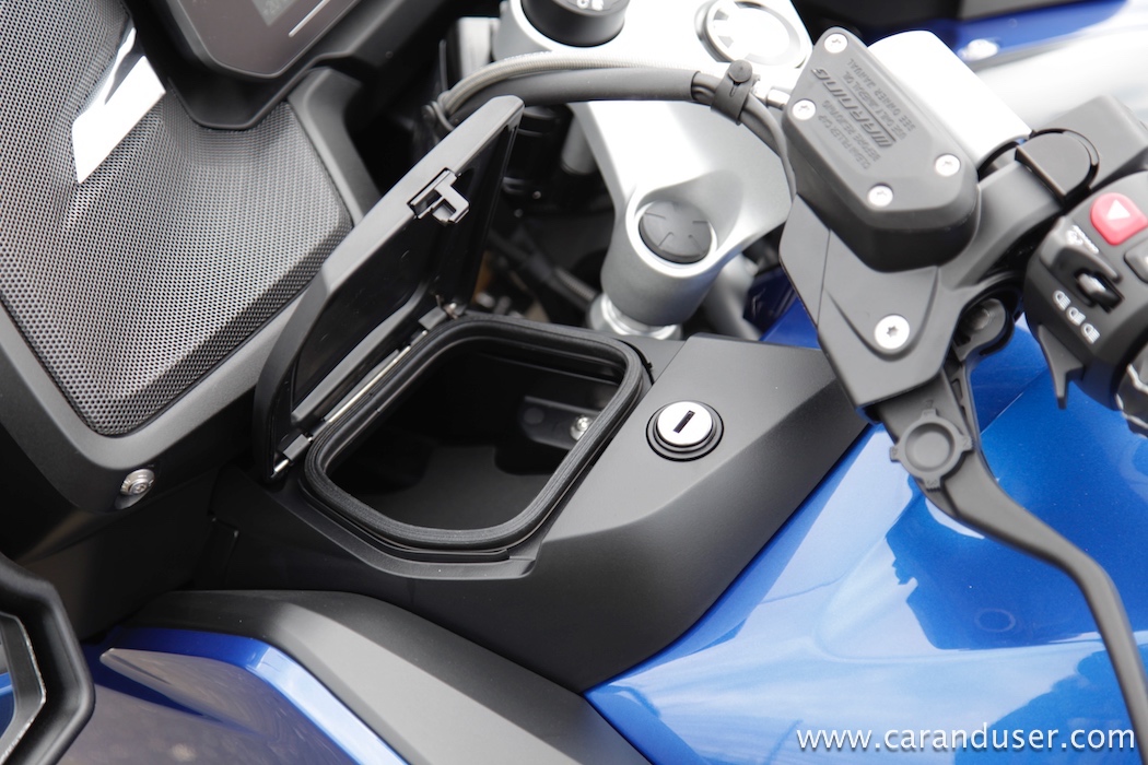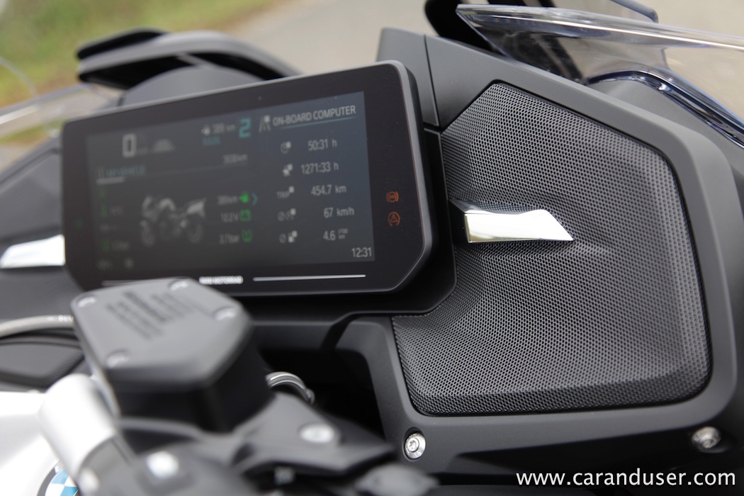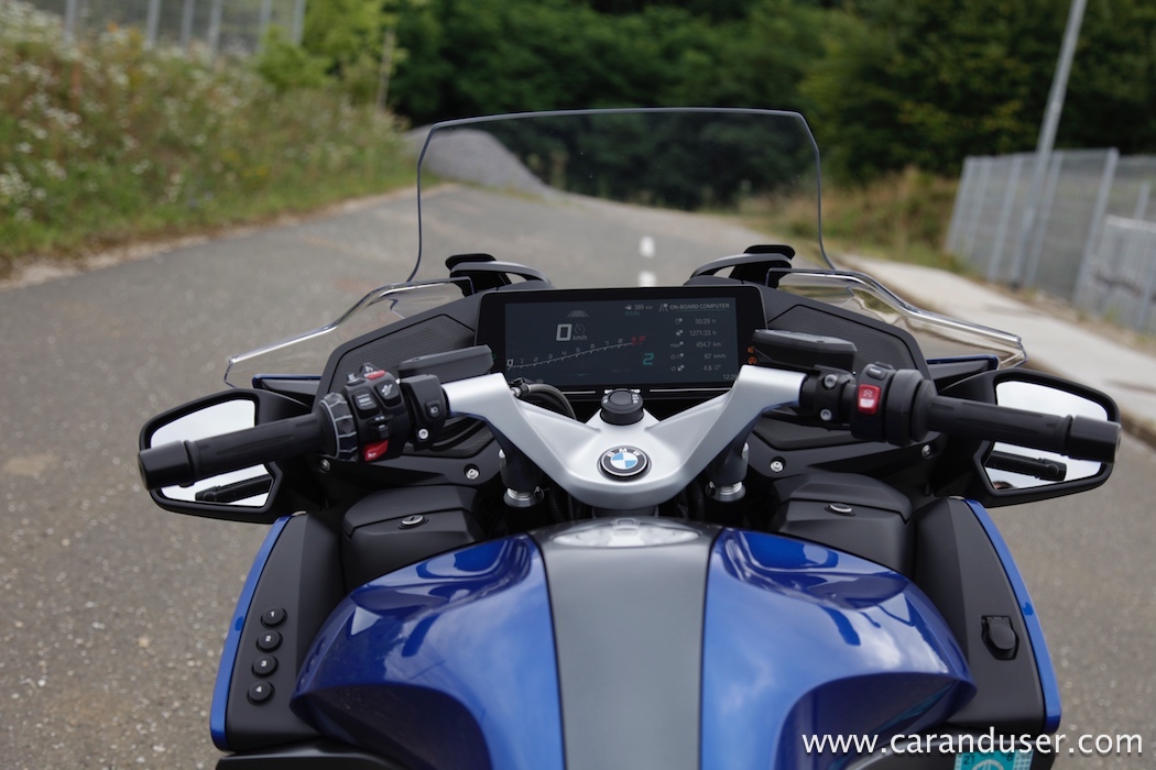 Izjemen je že pogled na armaturno ploščo, kjer kraljuje ogromen 10-palčni zaslon, ki združuje različne instrumente in dodatno omogoča dostop do praktičnih funkcij, kot so multimedija, navigacija in povezljivost. Testni motocikel je bil opremljen celo z radarskim tempomatom, ogrevanimi sedeži in pazi to – centralnim zaklepanjem prtljažnih kovčkov in shranjevalnih prostorov ter električnim pomikom vetrobranskega stekla. Vsa stikala so ergonomsko razporejena, po nekaj dneh sem zelo dobro vedel, s katerim stikalom upravljam katero funkcijo in kje je nameščeno, tako da je odvračanja pozornosti od ceste relativno malo, a po mojem mnenju vsekakor še vedno preveč. Preden se recimo dokoplješ do vklopa gretja ročic, lahko skoraj doktoriraš iz informatike. Zagotovo tega ne počnite med vožnjo.
