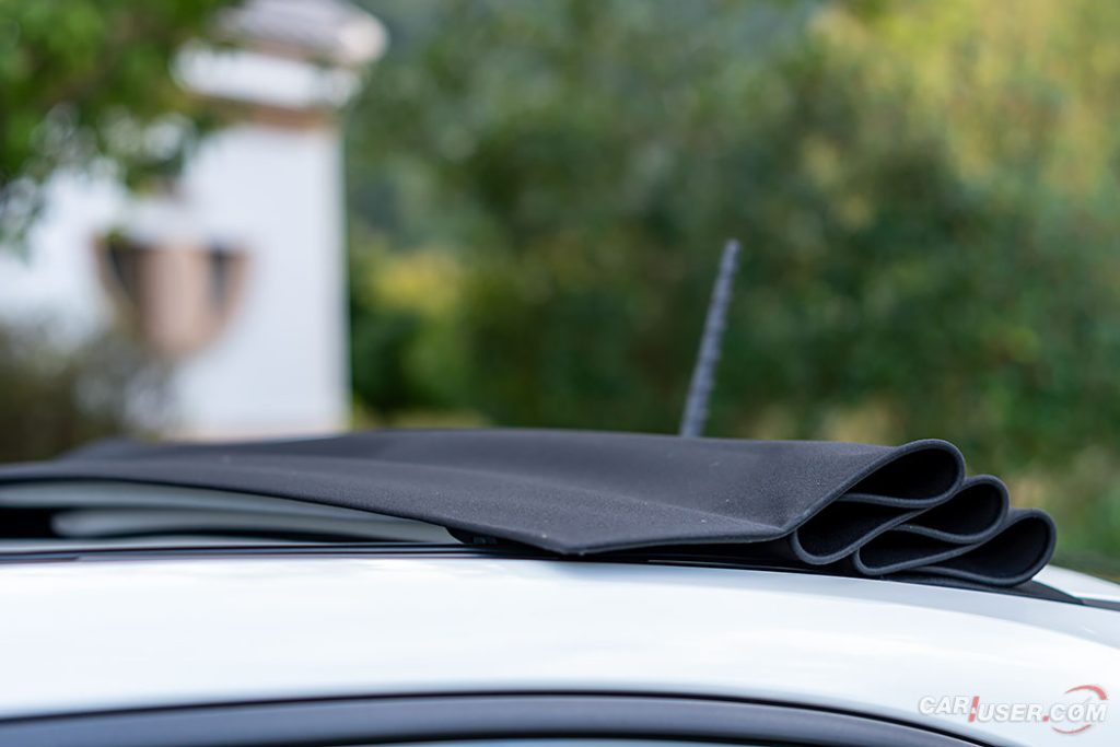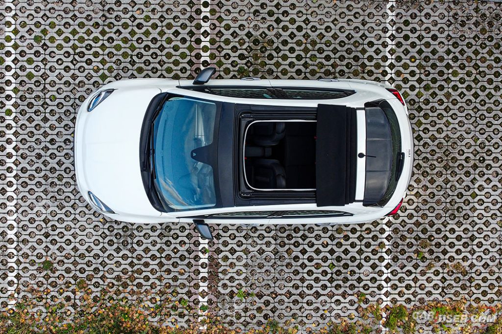 Testiranec pa še dodatno izstopa po svoji strehi! Slednja je platnena in se v dobrih 18 sekundah elegantno, v retro slogu, s pritiskom na gumb zloži na zadnji del strehe, nad nami pa se razprostre širno nebo … če seveda ne dežuje …