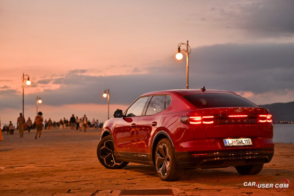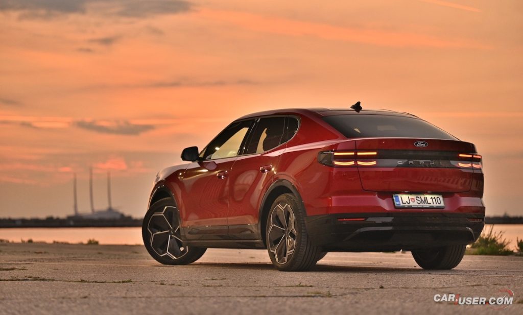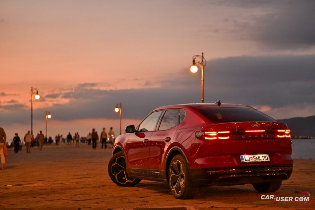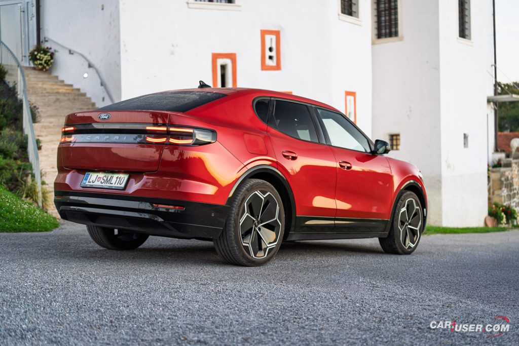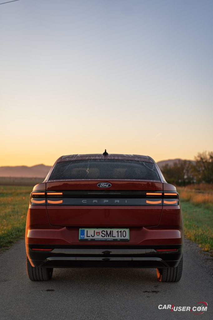 Capri EV je prav res všečen voz, ki nudi nemško e-tehniko v kombinaciji z ambientom znanim iz Forda Explorerja EV, njegov »joker« pa je zagotovo retro reinterpretacija legende izpred nekaj desetletij. Preklop na Sport vozni profil doda nekaj iskrivosti v sicer nič kaj skromen pogon na zadnji osi, a fizika in dve toni sto na tehnici pač terjata svoje pri agilnosti. Kljub dobremu »fordovsko« čvrstemu podvozju, zavore vsej tej masi niso kos, so precej mehke in s slabimi povratnimi informacijami – morda zaradi bobnov zadaj in diskov zgolj spredaj.