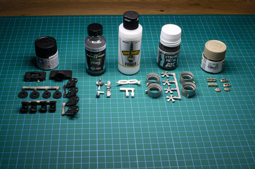 Za barvanje tokratnih sestavnih delov je bila kot osnova uporabljen AMMO bel one shot primer, Tamiyini akrilni barvi na vodni osnovi mat črna(XF-1) in zlat titan (X-31), za ponazoritev različnih kovin pa vrhunski barvi proizvajalca Alclad v odtenku nerjavečega jekla in AK-jeva Xtreme metal barva v odtenku Duraluminum, ki ima rahlo zlatkast priokus. Na zavornih čeljustih pa so kot dodaten detajl nameščene kričeče rdeče nalepke znamenitega proizvajalca zavornih sistemov.