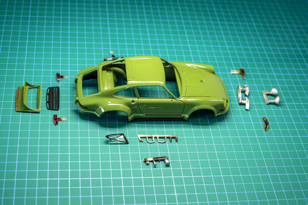 Najprej s pomočjo Tamiyinih barv in različnih čopičev pobarvamo strop makete z mat črno barvo (Tamiya XF-1) in ozadje zadnjih luči z imitacijo kroma (Tamiya X-11). Sledi sestavljanje in montaža sprednjih smerokazov, kateri v primeru DLS-a služijo tudi kot zračniki za sprenje zavore in sestavljanje in montaža žarometov. Kot že omenjeno, je prileganje vseh sestavnih delov vrhunsko in pri natančnem pozicioniranju stekel na reflektorje žarometov sta nam v pomoč dva utora, s katerimi zagotovimo pravilen kot in obliko žarometov.