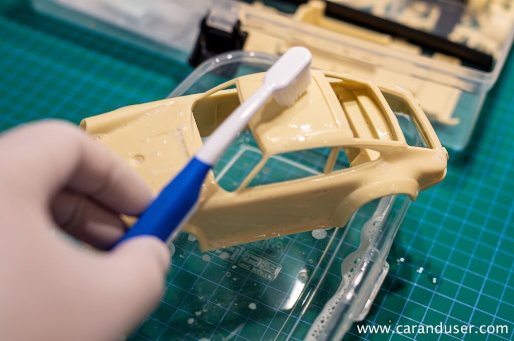 Vse resinske dele namočimo v posodo z mlačno vodo in dodamo nekaj detergenta. Po krajšem času vsak sestavni del vzamemo iz vode in ga z zobno ščetko dobro skrtačimo, da dosežemo vse špranje. Počakamo, da se vsi delo posušijo.