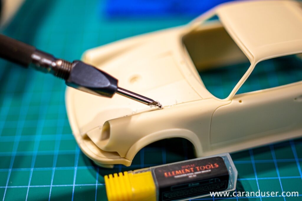 Reže lahko poglabljamo tudi s konico skalpela, vendar to v merilu našega Porscheja pomeni precej prevelike reže. Za občutek, ponavadi so reže na pravih avtomobilih velike približno 5mm, kar pomeni, da to v merilu 1:24 znaša če 0,2 mm. Za ta namen obstaja v svetu maketarstva posebno rezilo v obliki kavlja.