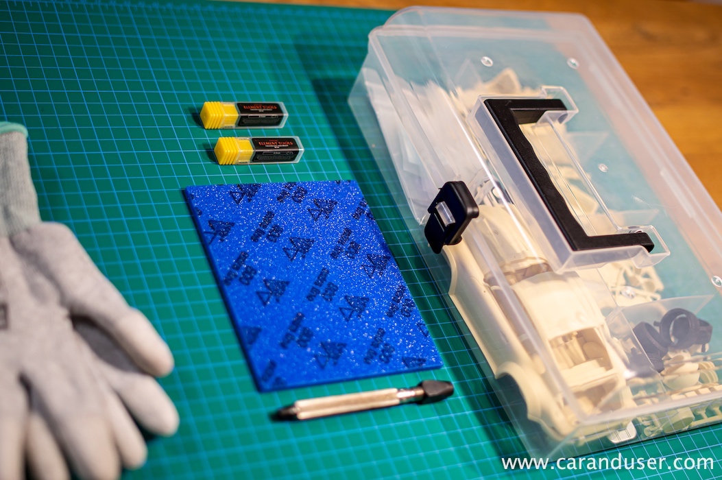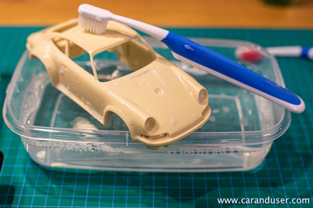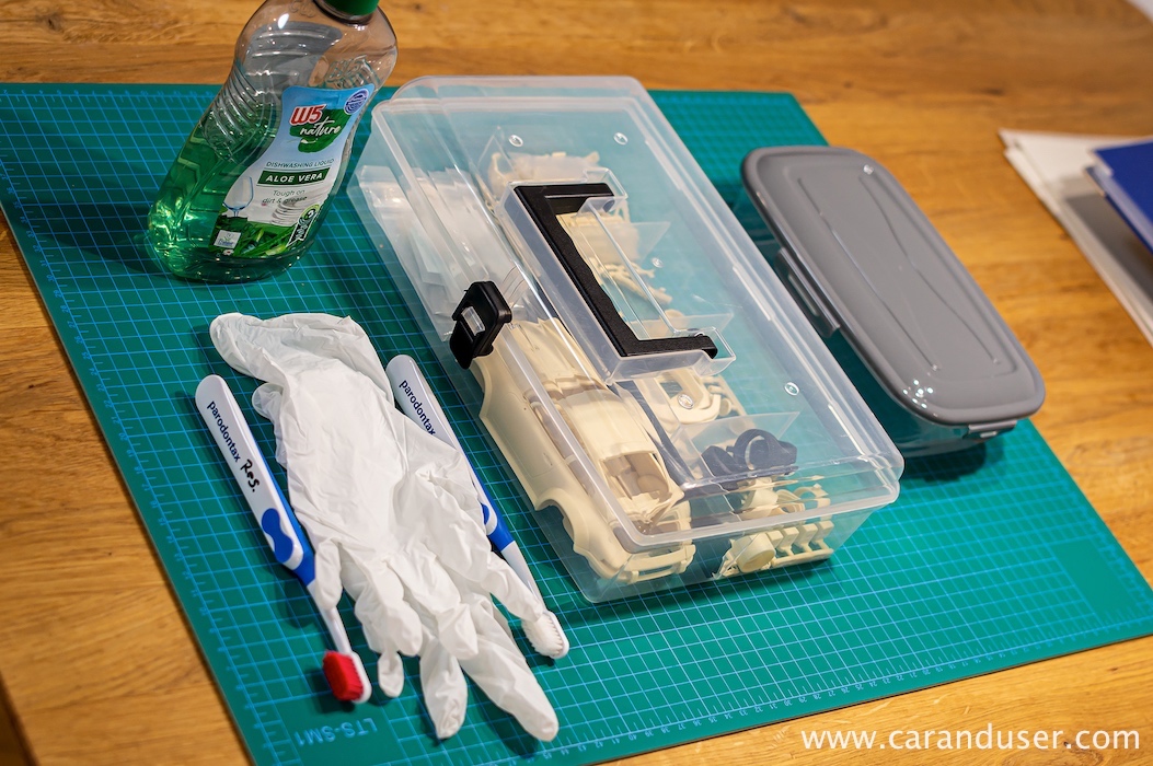 Vse resinske dele namočimo v posodo z mlačno vodo in dodamo nekaj detergenta. Po krajšem času vsak sestavni del vzamemo iz vode in ga z zobno ščetko dobro skrtačimo, da dosežemo vse špranje. Počakamo, da se vsi delo posušijo.