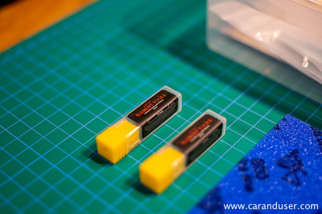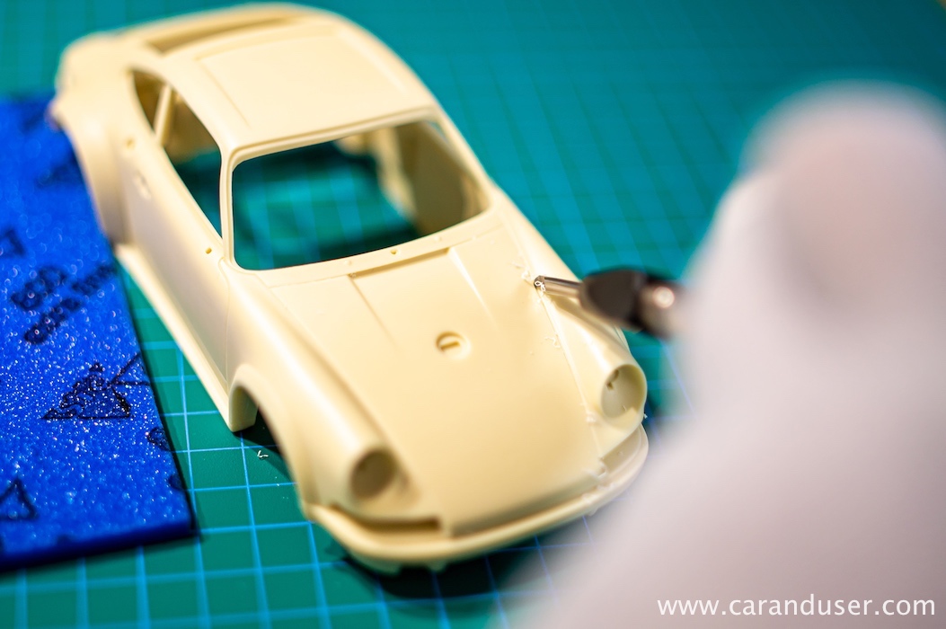 Reže lahko poglabljamo tudi s konico skalpela, vendar to v merilu našega Porscheja pomeni precej prevelike reže. Za občutek, ponavadi so reže na pravih avtomobilih velike približno 5mm, kar pomeni, da to v merilu 1:24 znaša če 0,2 mm. Za ta namen obstaja v svetu maketarstva posebno rezilo v obliki kavlja.