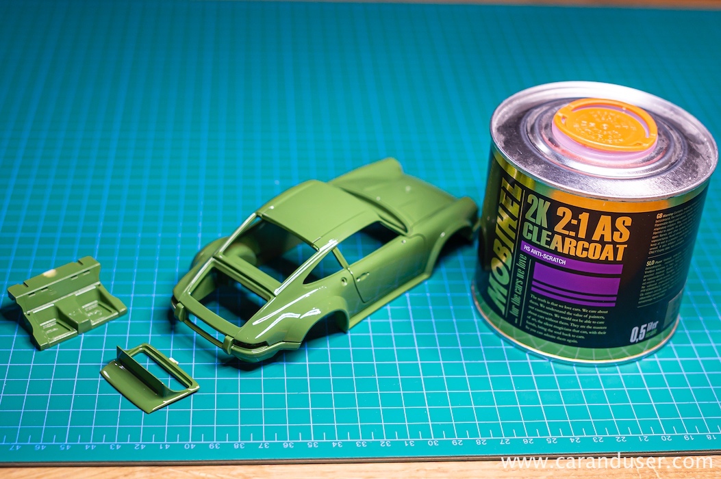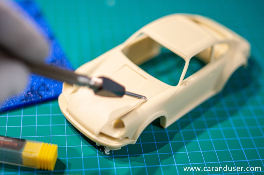 Ko zagotovimo, da so vsi odlitki očiščeni silikatov, sledi priprava na barvanje. Zaradi načina brizganja plastike, oziroma v tem primeru ulivanja resinske smole, so pri maketah, kjer je celotna karoserija iz enega dela, reže med različnimi karoserijskimi deli premalo globoke. Sledi postopek poglabljanja spojev s čemer zagotovimo, da bodo reže vidne tudi po vseh slojih barve in laka, ki jih imamo namen nanesti na karoserijo.