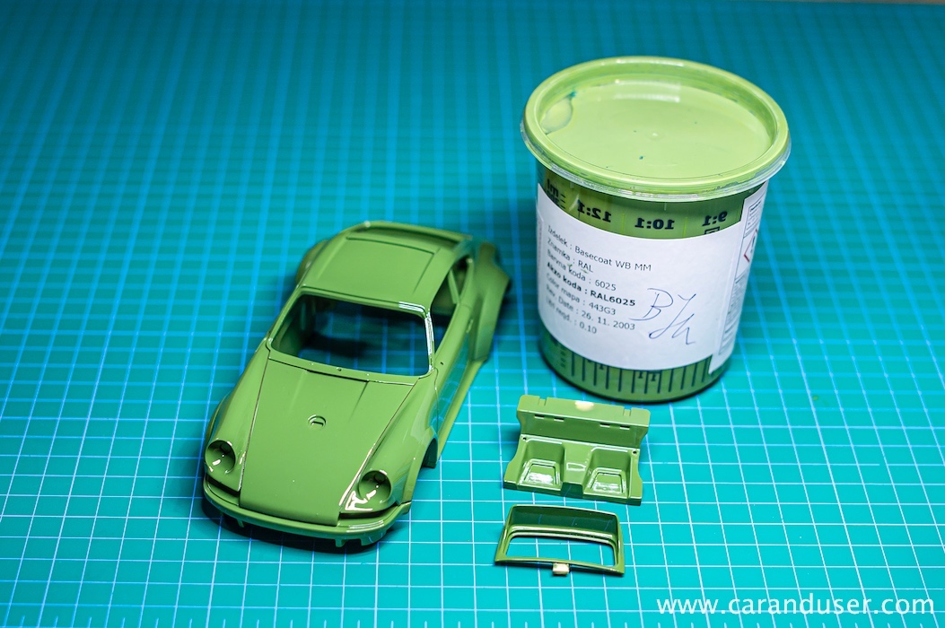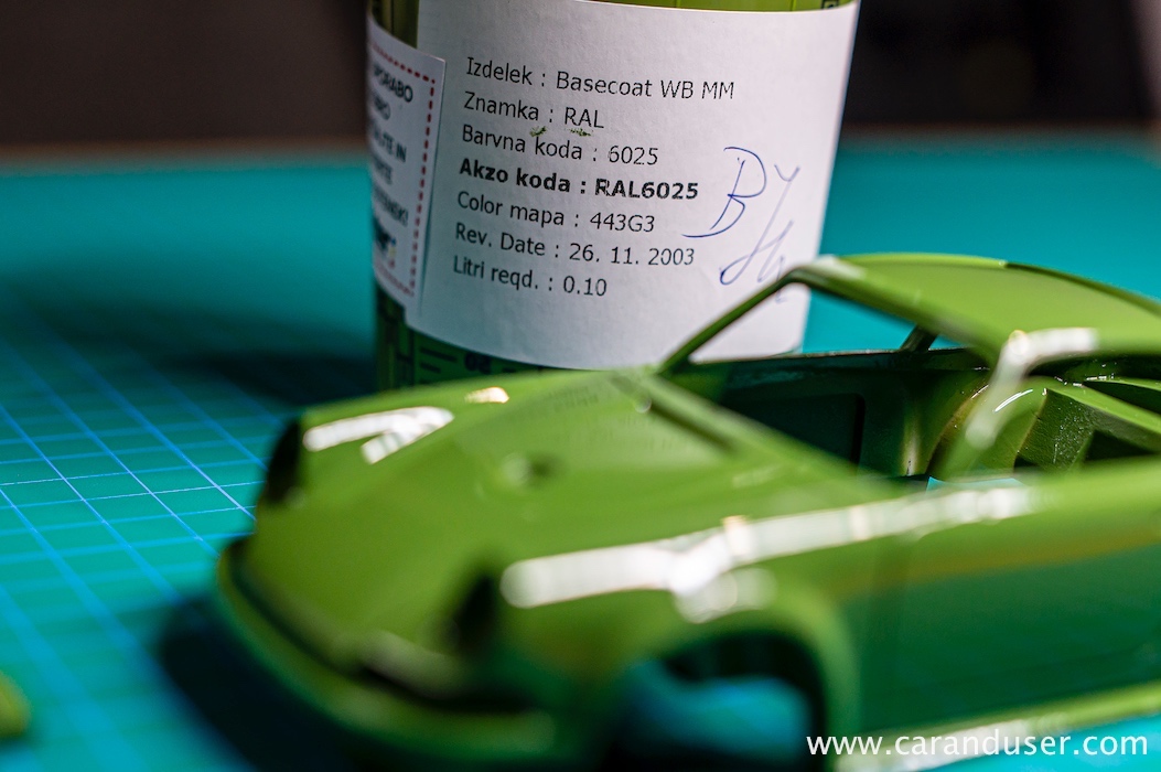 Sledi nanašanje barve z zračnim čopičem (airbrush). Uporabljen airbrush ima premer igle in šobe 0,5 mm, za ta namen je uporabljena barva namenjena profesionalnim ličarskim popravilom pravih avtomobilov proizvajalca AkzoNobel, izdelana pa je na vodni osnovi kar nam omogoča enostavno čiščenje uporabljenih pripomočkov pod tekočo vodo. Tokrat uporabljeni odtenek barve je bil pripravljen s strani strokovnjakov podjetja Spekter Žalec. Na podlagi vzorca priloženih nalepk in pa referenčnih slik pravega avtomobila, je najboljše ujemanje prestavljal barvni odtenek Fern Green z RAL oznako 6025.