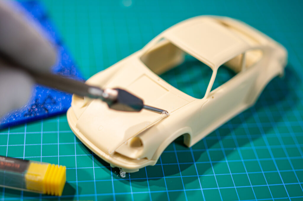 Ko zagotovimo, da so vsi odlitki očiščeni silikatov, sledi priprava na barvanje. Zaradi načina brizganja plastike, oziroma v tem primeru ulivanja resinske smole, so pri maketah, kjer je celotna karoserija iz enega dela, reže med različnimi karoserijskimi deli premalo globoke. Sledi postopek poglabljanja spojev s čemer zagotovimo, da bodo reže vidne tudi po vseh slojih barve in laka, ki jih imamo namen nanesti na karoserijo.