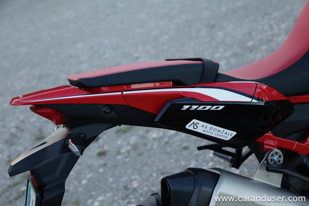 Navdušila me je tudi njena ciklistika, ki sem jo ravno zaradi nenormalnih vremenskih pogojev dodobra izkusila. Prevozili sva vse od sončne Primorske, hitrih avtocest pa do stoletnih nalivov in celo točo sva našli tam na Črnem kalu. Ampak v vseh omenjenih razmerah jo lahko samo potrepljam in pohvalim. V vseh pogojih sem imela v Africo popolno zaupanje. Na avtocesti se je izkazal večji agregat s 1.084 kubičnimi centimetri, ki zdaj zmore 75kW (102 KM) / 7,500/min in 105 Nm / 6,250/min. Primerno sta dodelana tudi menjalnik in sklopka. Pohvali se s tristopenjskim sistemom proti dvigovanju prednjega kolesa, ki pa ga lahko bolj kaskadersko naravnan motorist tudi popolnoma izključi.