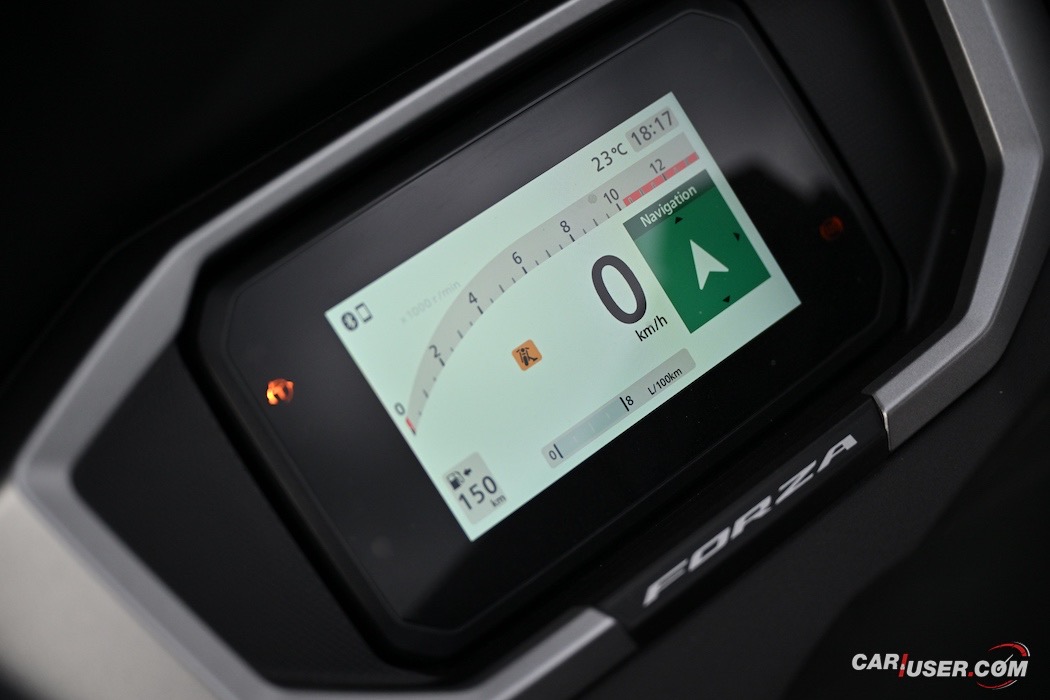 Čeprav so mestni skuterji nekako – kot že samo ime pove – namenjeni mestnim središčem, pa sem sam v preteklosti često pogrešal navigacijo. Saj veste, na motociklu ni ravno pametno prodajati zijal in zevati naokoli ter iskati hišne številke, se fokusirati na table z napisi ulic itd. Pri Forzi je sedaj namenščen 5-palčni TFT zaslon, ki vam, v kolikor preko modrega zoba sparite vaš telefon, poleg osnovnih podatkov vožnje, prikazuje tudi navigacijo, lahko poslušate sporočila, opravite klice (tega seveda ne priporočamo!), si predvajate glasbo …
