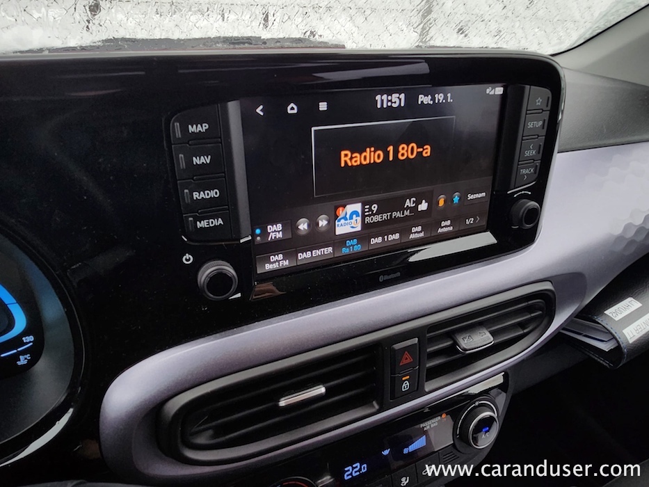 Pri uvozniku so v testno floto spustili praktično najbolje opremljeni i10, ki ga je moč naročiti, le N-Line različica ga z navitim turbomlinčkom pričakovano prekaša – tako v zmogljivosti, kot videzu in seveda tudi ceni. Kakorkoli, i10 Premium je najvišji sklop rednega ne-športnega cenika. Če ga obkljukate boste v vozu prejeli 8-palčni osrednji zaslon občutljiv na dotik in multimedijo združljivo s sodobno mobilno navlako, sistem za brezžično polnjenje le-te, parkirna tipala na zadku in LED svetila nameščena prav tam. Pri uvozniku so dodali še zimski paket in pametni paket SMART. Kaj več bi v tako majhen avtomobil stežka spravili, poleg tega pa verjetno niti ne bi potrebovali, saj je i10 prvenstveno igralec za hitro ulično košarko, dolge NBA ali evroligaške dvoboje s tekanjem po celotnem igrišču raje prepušča svojim višjim klubskim kolegom.