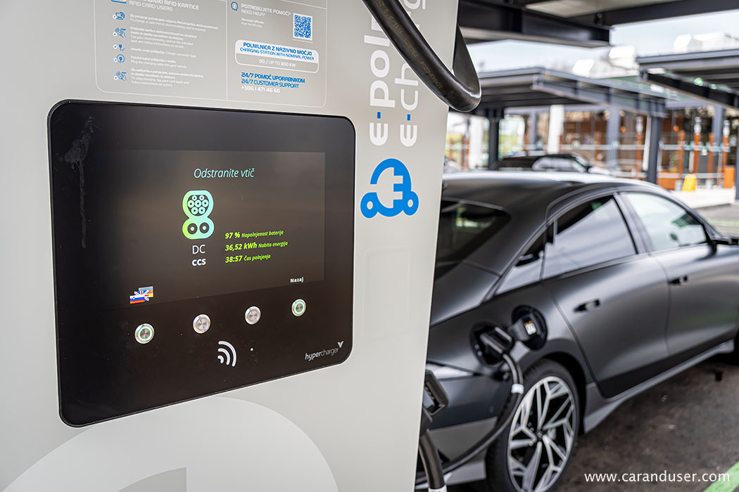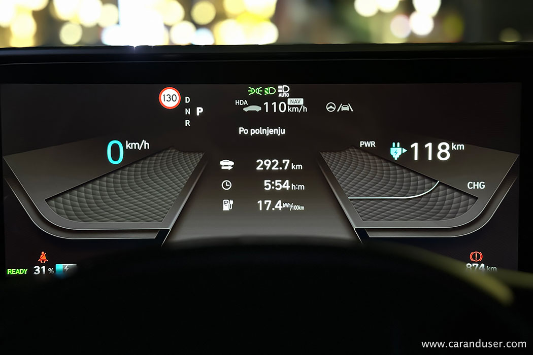 Prav ta napetost je glavna prednost Ioniqa pred ostalimi primerljivimi konkurenti, saj 800-voltna arhitektura ob uporabi ustrezne infrastrukture omogoča izjemne polnilne vrednosti. Nam je uspelo na hitri DC (enosmerni tok) polnilnici s konično močjo 300 kW Ioniqa polniti z 267 kW, kar je pomenilo, da je baterija dosegla 80 % napolnjenost v 18 minutah in je potrebovala nadaljnjih 22 minut do 100 % napolnjenosti. Pri tem naj izpostavimo podatek, da sta omenjena polnilna časa enaka ne glede na predhodno napolnjenost baterije in omogočata enostavno planiranje premorov med potovanji.