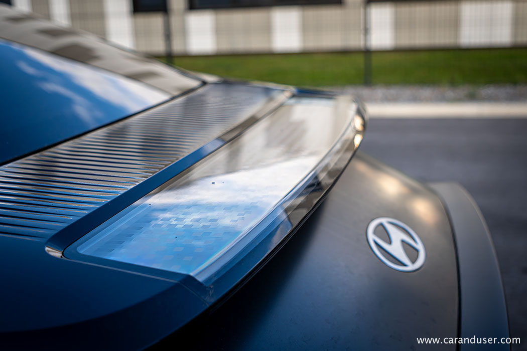 Temu ne moremo oporekati, oblikovalci so se potrudili in Ioniqu dodali detajle, ki prepričajo, večina teh je povezanih s »piksli« in elektriko. Posebej v oči padejo smerniki v zunanjih »ogledalih«, antena na strehi vozila, ki s svojo prosojno plastiko razkrije vso svoje elektronsko drobovje in zadnji spojler z integrirano zavorno lučjo po vzoru legendarne Porschejeve 911-ke.