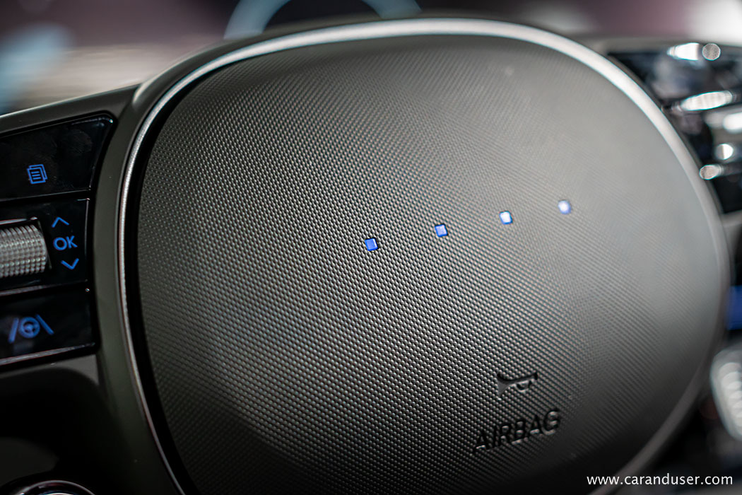 Zanimiv detajl je nov Hyundaiev logo na volanu. 4 kvadratki pomenijo v Morsejevi abecedi črko H, hkrati so kvadratki osvetljeni in služijo kot indikator napolnjenosti baterije med polnjenjem.