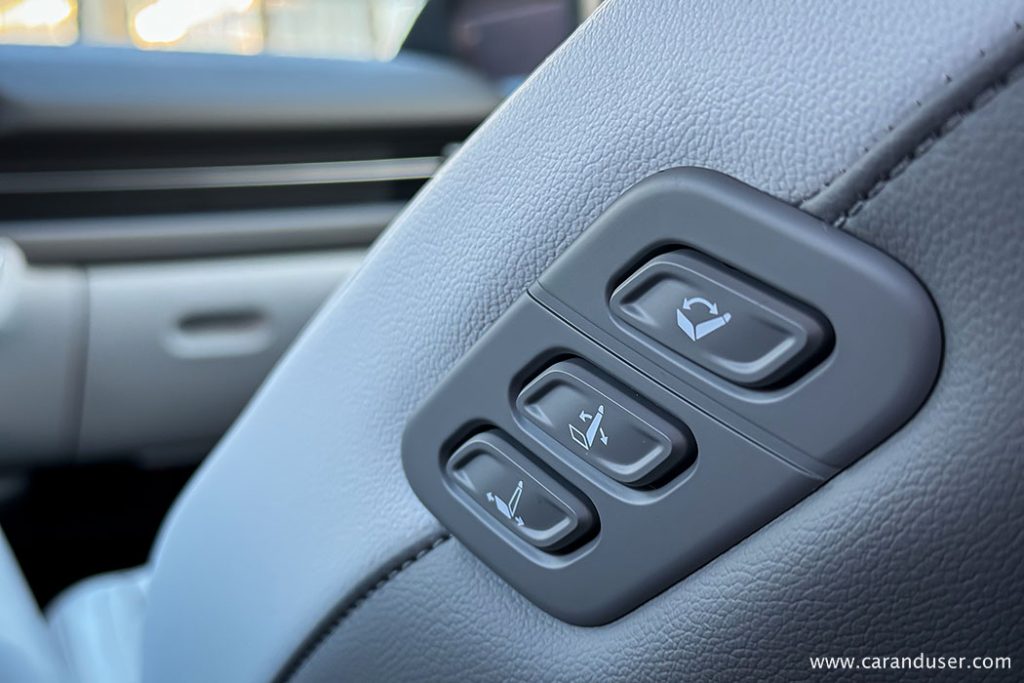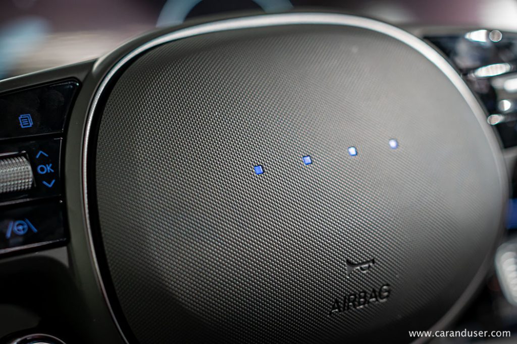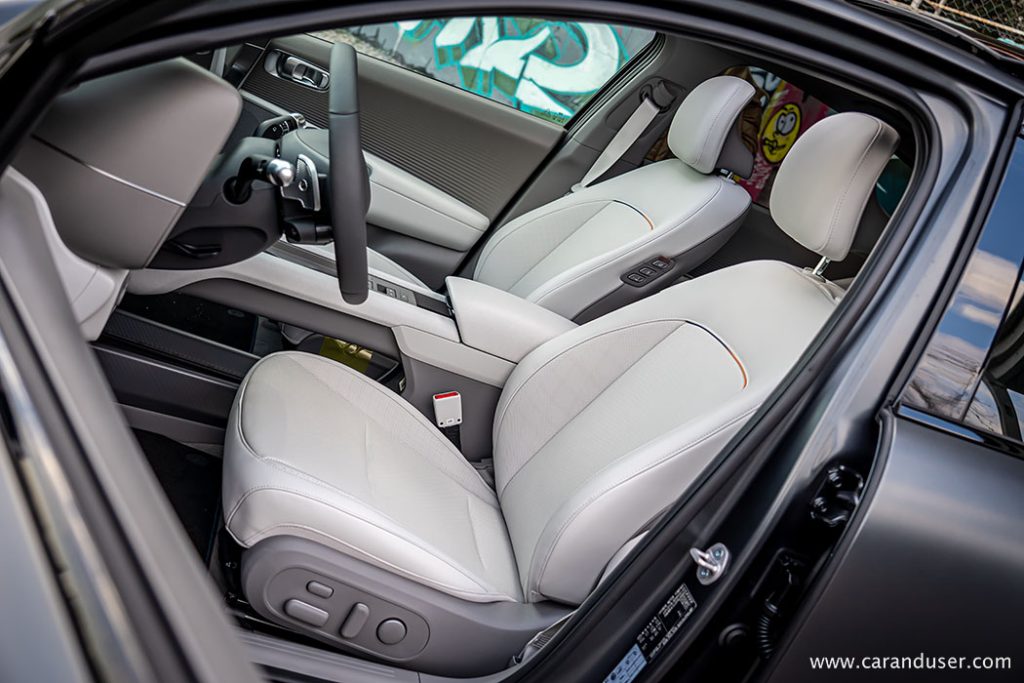 Ostalih pripomb o obliki in kvaliteti notranjosti nimamo, uporabljeni materiali so kljub kombinaciji z nekaj »ekološkimi« vsadki vrhunski, notranjost deluje prestižno, prepriča vonj po pravem usnju in na otip prijetne strukture tudi nekaterih trših »eko« plastik. Notranjost jemlje navdih pri Ioniqu 5 s katerim si deli števce in info-zabavni sistem in je moderna, prečiščena, pregleda ter intuitivno uporabna.
