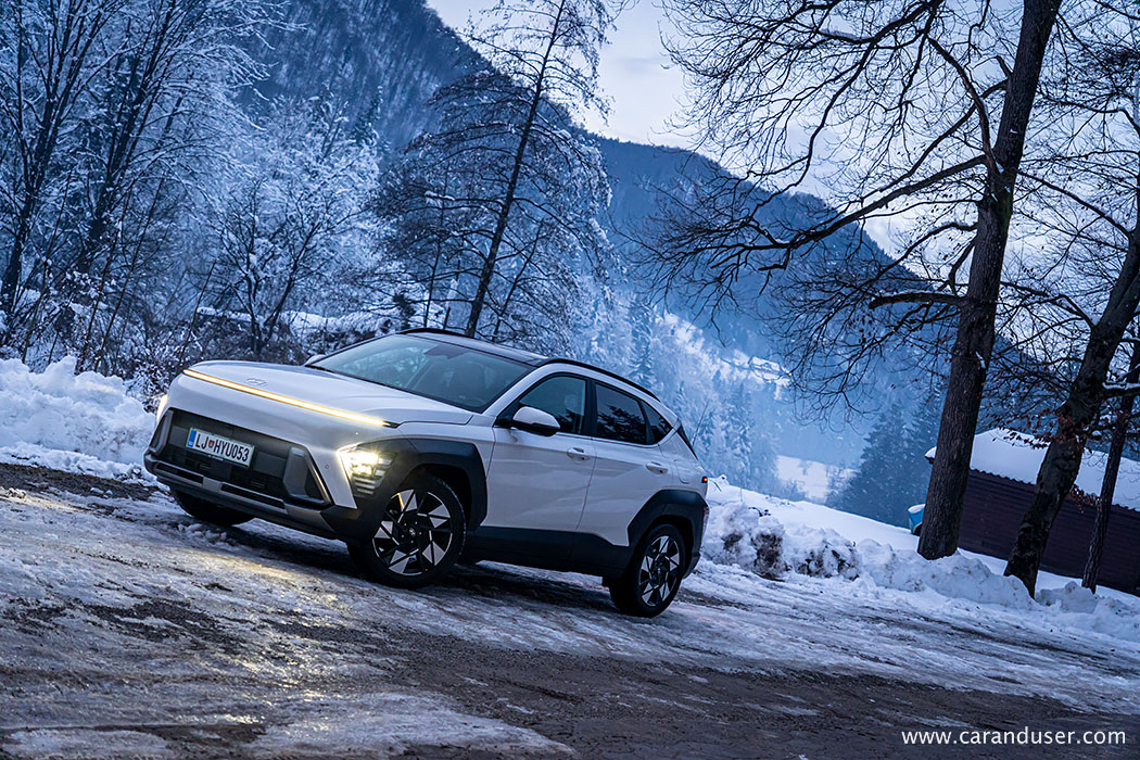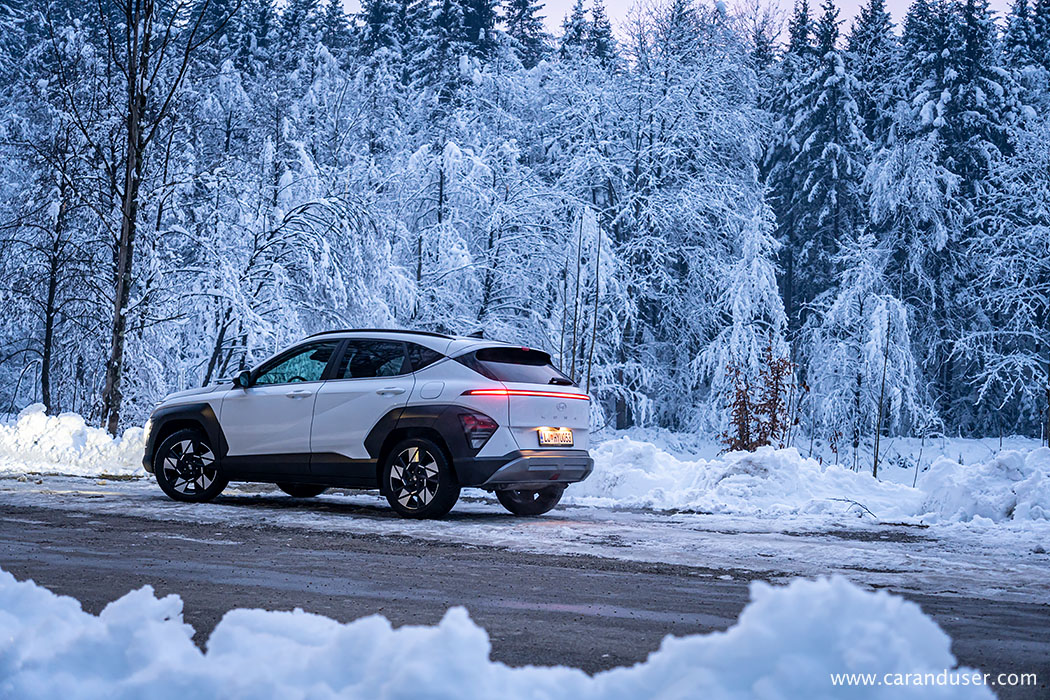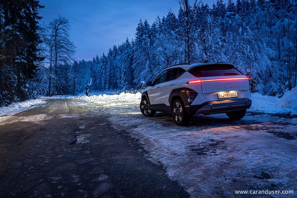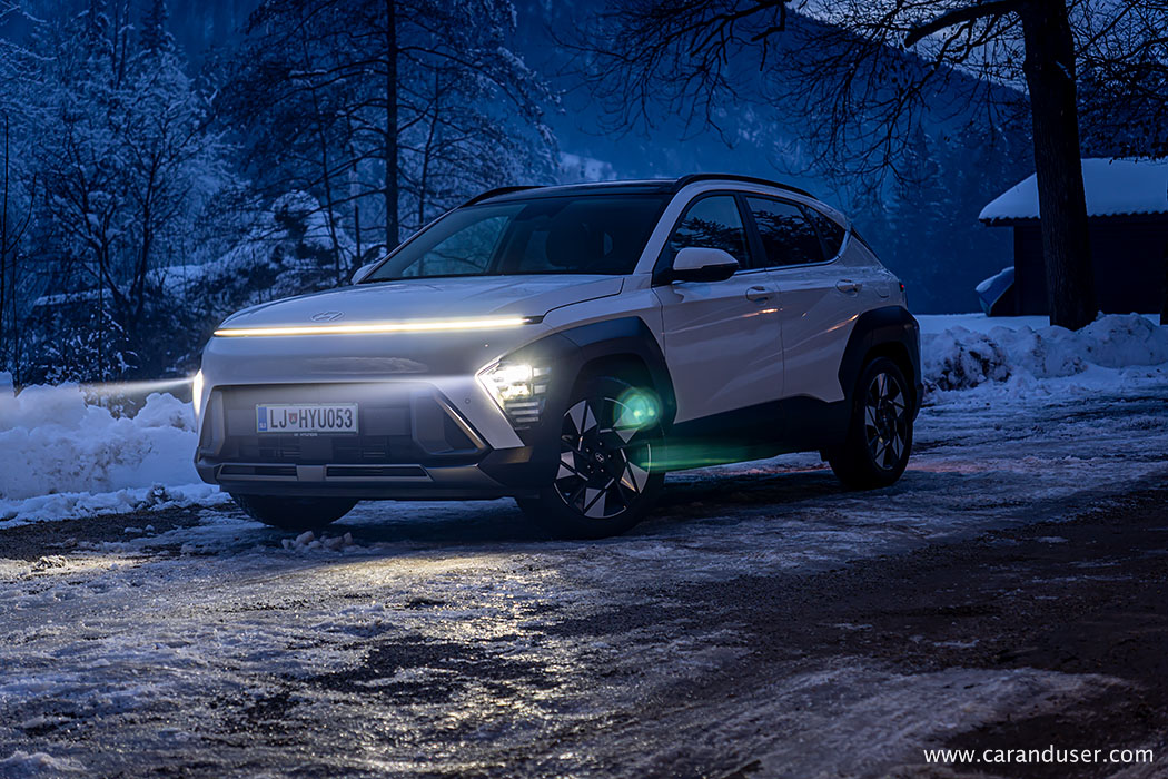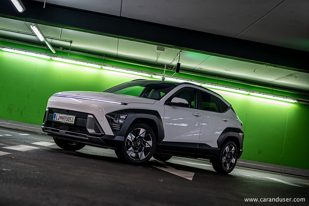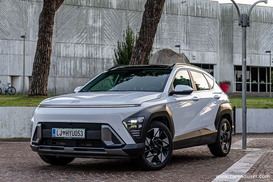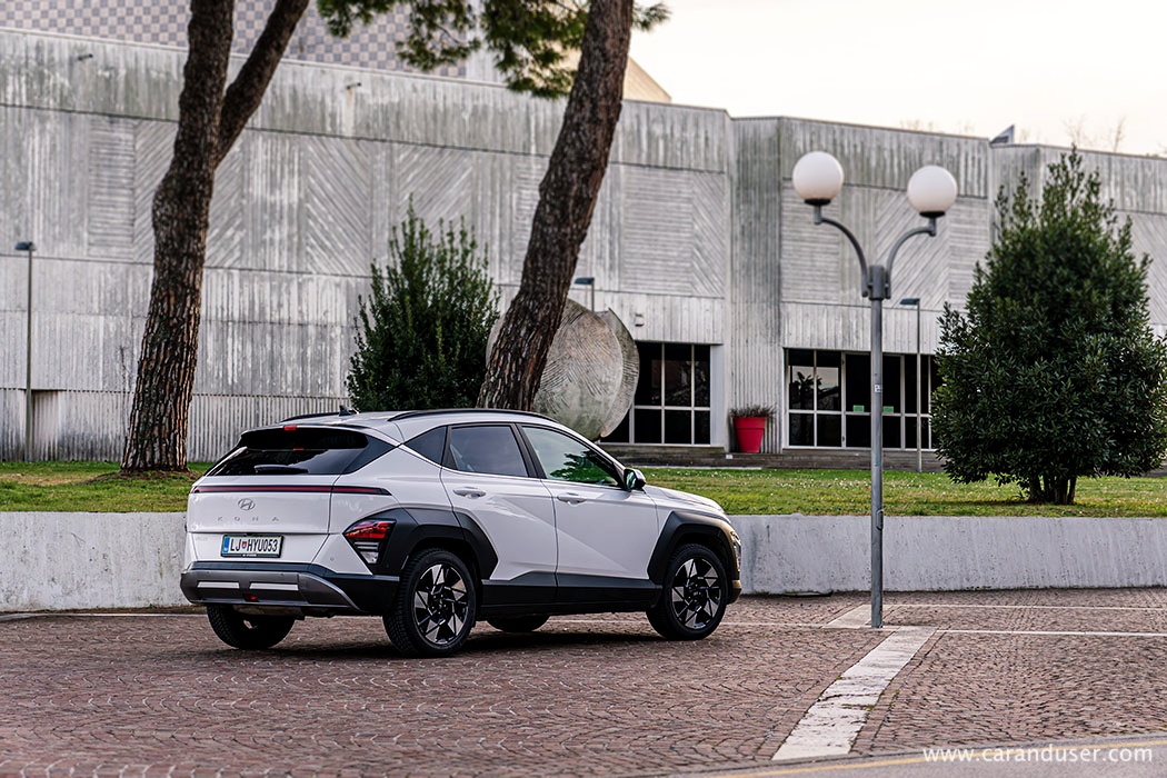V zavojih je prisotnega nekaj nagibanja, a je to zmanjšano do te mere, da postane po parih kilometrih vožnje to povsem nemoteče in naravno. Manjša pripomba pripada zgolj t. i. poltogi zadnji premi, ki ob slabih diletacijah, ali ponesrečnim krpanjem naših cest na trenutke odreagira malce živčno. Kljub vsemu je teh primerov ob sproščeni vožnji, kakršna je Kona s tem agregatom in podvozjem, tako malo, da na “hibo” hitro pozabimo. Pohvaliti velja izjemno zvočno izolacijo kolotekov in potniške kabine, saj med našim testom praktično nismo našli asfaltne podlage ali hitrosti, pri kateri bi se hrup prenesel do potnikov v kabini, kot tudi izjemne LED žaromete ob katerih se še tako megleno nočno potovanje spremeni v sončni izlet.