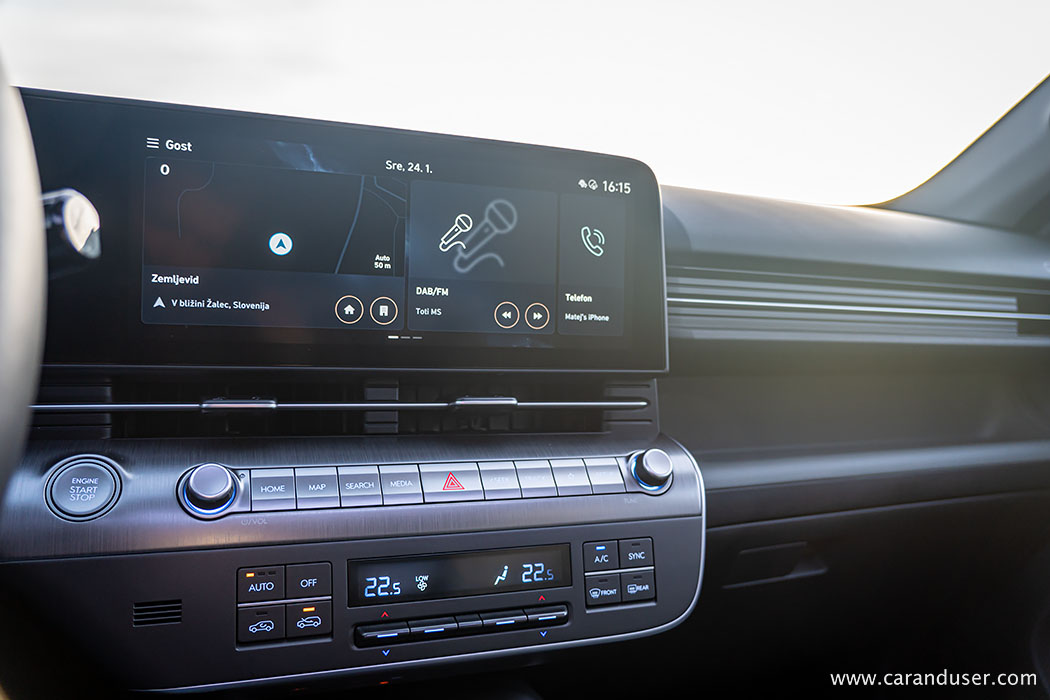 Pa začnimo s slednjim. Takoj ob prvem stiku z voznikovim okoljem je jasno, da so pri Hyundaiju upoštevali kritike večine sveta in najpomembnejše, ter največkrat uporabljene, komande pustili na za to posebej namenjenem delu armaturne plošče v obliki klasičnih gumbov. Ergonomija uporabe dvoporočne klimatske naprave je poznana in intuinuativna ter omogoča upravljanje brez pretiranega umikanja pogleda s cestišča. Naslednji v nizu je info-zabavni sistem. Ta se v rahlo ukrivljeni stekleni celoti z digitalnimi merilniki bohoti na 12,3 palcih. Uporabniški vmesnik so pri Hyundaiju, v primerjavi s prejšnjo generacijo Kone, precej nadgradili in ga naredili še bolj enostavnega za uporabo. Po novem zna Kona prikazati in povedati vse stvari tudi v slovenščini! Nov uporabniški vmesnik omogoča uporabo več različnih profilov, ki jih lahko posameznik prilagodi svojim željam in potrebam. Navigacija deluje brezhibno in zna ob povezavi na vaš pametni telefon izbrati najhitrejšo pot do cilja ter vas obvarovati pred izgubljanjem živcev v dolgih zastojih.