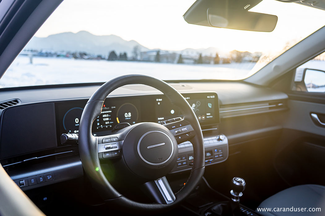 Manjšo kritiko na račun ergonomije si zasluži zgolj nenavadno postavljen gumb za upravljanje elektronske ročne zavore, kateri se nahaja na mestu kjer bi običajno pričakovali gumbe za nastavljanje višine snopa žarometov in regulacijo jakosti osvetlitve armaturne plošče. Hkrati pa je potrebno priznati da sistem Auto hold v testni Koni deluje tako dobro, da smo gumb ročne zavore uporabljali le pri manevriranju v in iz garaže, ko voznik ni pripet z varnostnim pasom.
