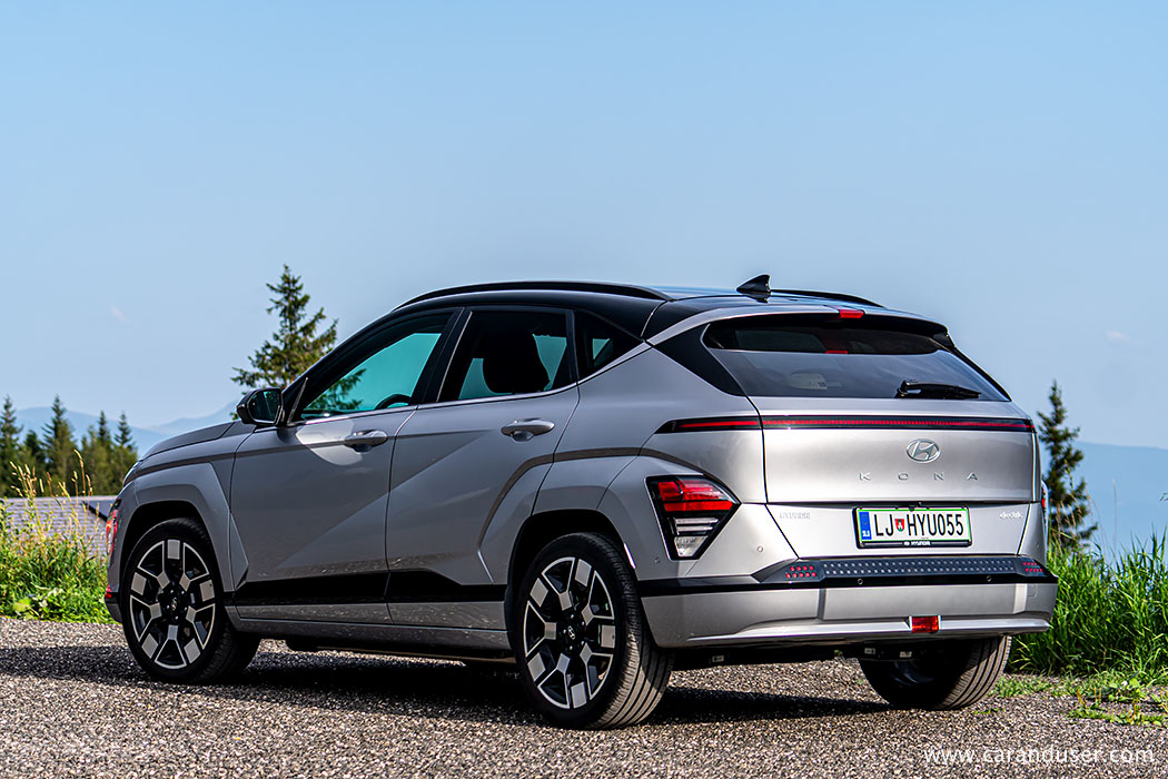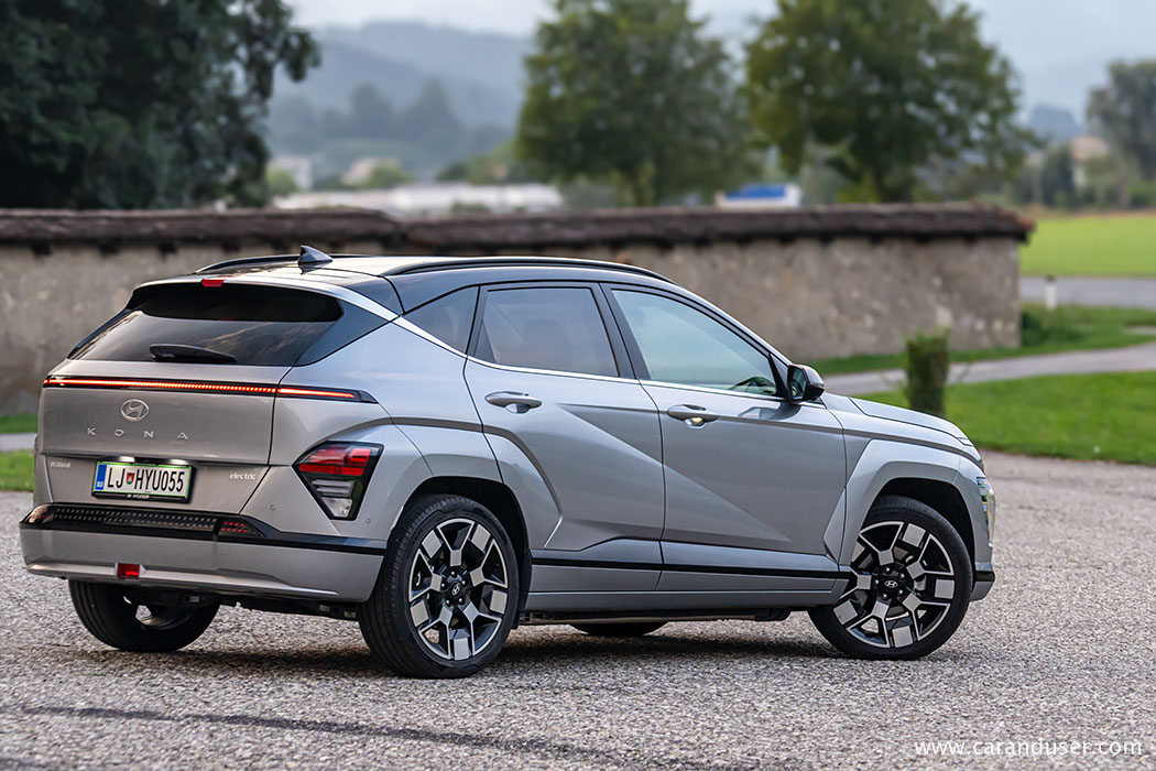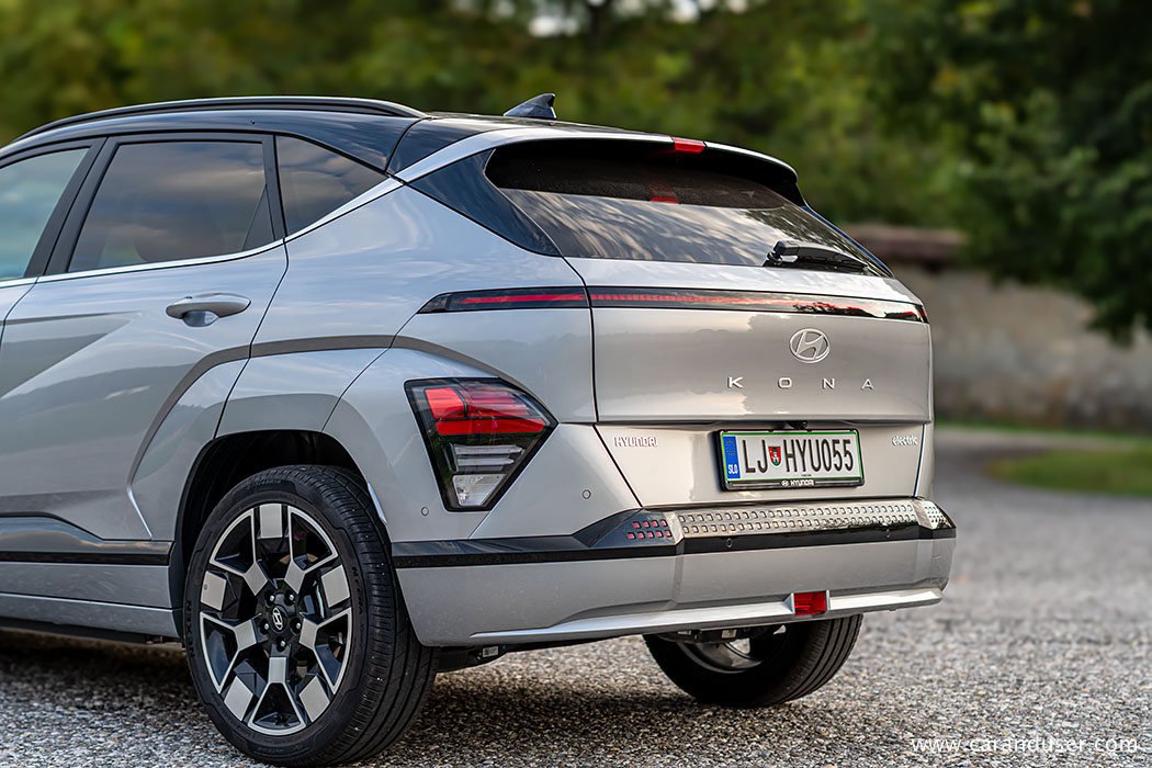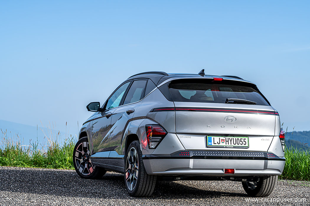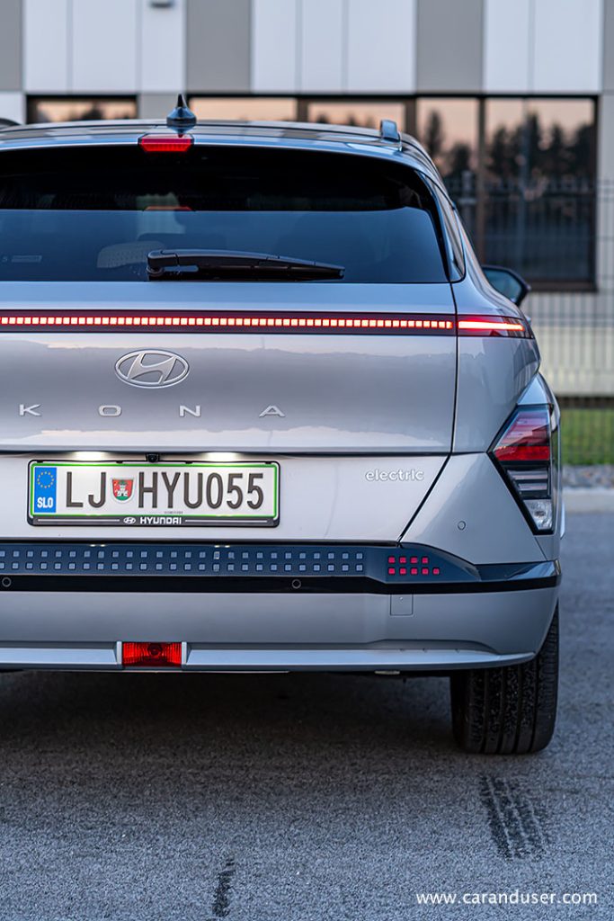 Kar je najbolj očitno pri vsakem avtomobilu, je njegova oblika. Obliko nove generacije Hyundaijevega B-SUV-ja smo pohvalili že ob druženju z njeno bencinsko sorodnico. Električna različica pa z malenkostni spremembami deluje še bolj prepričljivo in prestižno. Za razliko od klasične Kone, ima eklektična obrobe okoli koles odete v barvo karoserije, kar v izvrstni srebrni barvi z dvobarvno kombinacijo črne strehe deluje izjemno skladno. Prav omenjena barva pa še poudari ostre linije nove Kone. Platišča so pri opremi Impression v primerjavi z bencinarjem palec večja in merijo 19 palcev, ki še dodatno ozaljša atraktivno obliko karoserije. Da bo tudi v temi jasno opazno, da gre za štromarsko različico Kone, sta sprednji in zadnji svetlobni podpis oblikovana v za Hyundai značilnih pikslih.