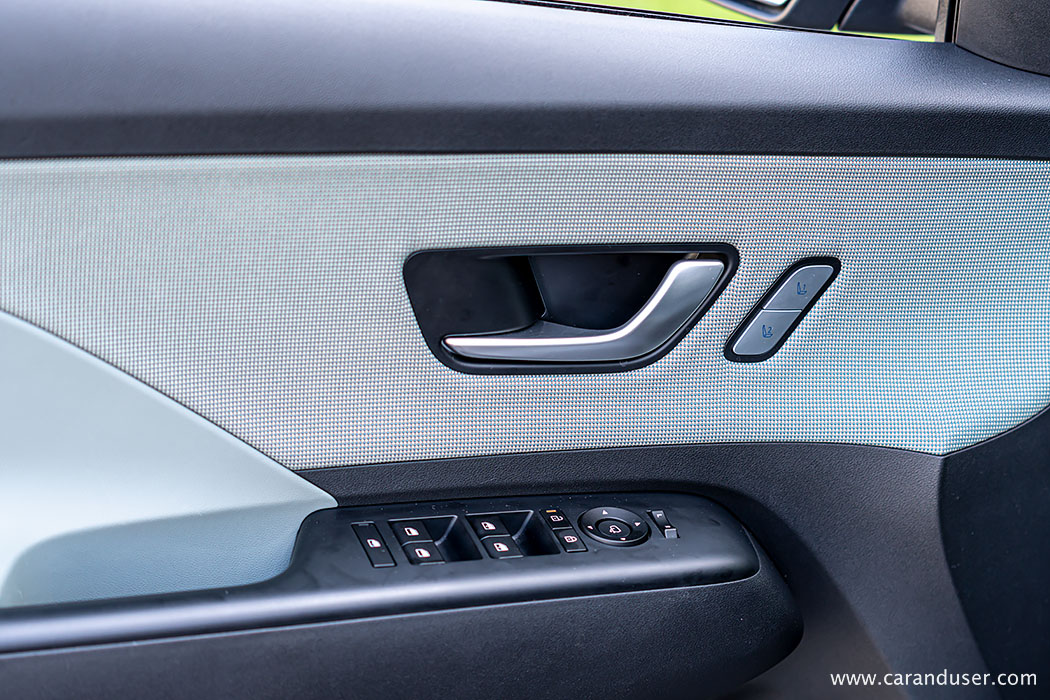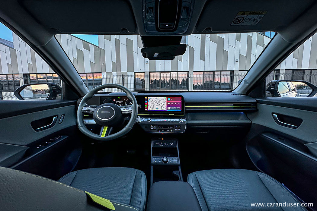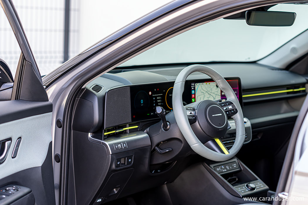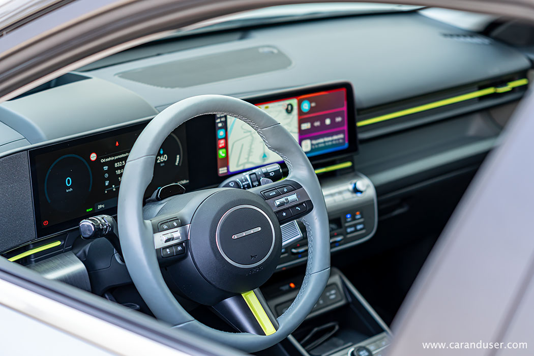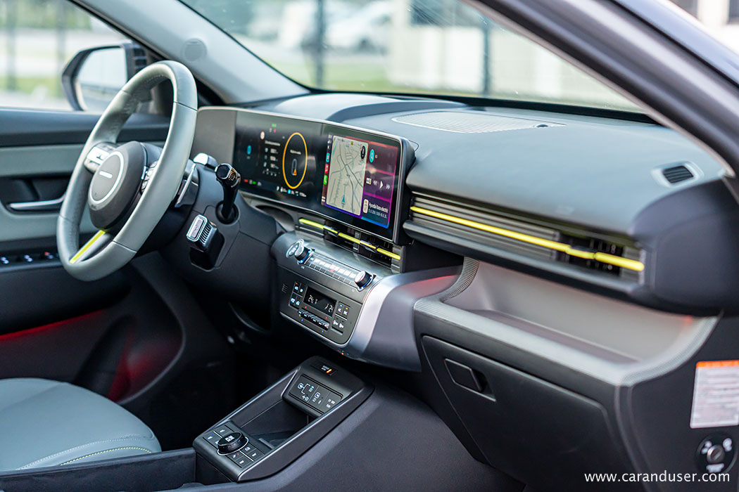 V notranjosti razlik v primerjavi s klasično Kono praktično ni. Takoj opazimo odsotnost ročice menjalnika in enoto za “Head-up” zaslon. Ostalo je identično klasični Koni … in to je več kot dobro. Ergonomsko je vse tam kjer mora biti, fizičnih gumbov je dovolj, da prestavljanje najnujnejših stvari ni moteče. Prikazovalnika števcev in info-zabavnega sistema merita vsak po 12,3 palca in sta izjemno pregledna ter nemoteča tudi med vožnjo ponoči. Ker gre za električno izvedenko, je info-zabavnemu sistemu dodan zavihek “povezan z vsemi funkcijami” in informacijami povezanimi z električnimi funkcijami vozila. Slednje omogoča, da lahko kadarkoli preverite, koliko energije vam je med vožnjo uspelo regenerirati in koliko ste jo porabili za ohlajevanje potniške kabine.