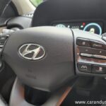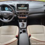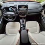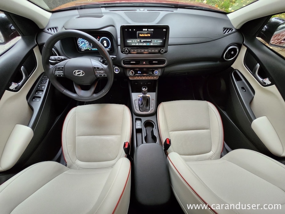 Videz je tako zmes sodobnega Hyundaijevega oblikovnega sloga z že omenjenim črno-plastičnim dekorjem, ki ga lično zaključuje črna streha. Pri uvozniku so testnico obuli v nič kaj zimske 18-palčne čeveljce, vendar se nad dobrim videzom pač ne gre pritoževati. Bi vi odslovili mladenko, ki bi na zmenek prišla s salonarji namesto v dežnih škornjih? Se mi je kar zdelo … Kakorkoli, da sem nekaj sekund preživel v zmoti sem ugotovil hipoma po vkrcanju na usnjen in v belo barvo odet voznikov sedež. Za nekaj trenutkov sem se ustavil in videl naslednji kader: »beli leder zici« z redečo obrobo, polno stikal za vkop in izklop najrazličnejše opreme, ker (k sreči) Kone digitalna čistka še ni dobila v kremplje, ter neslišen zagon pogona. Da je bila mera zmote še toliko bolj polna je poskrbelo ozvočenje Krell, ki navdušuje tudi audiofile med vozniki. Ta ameriški produkt namreč prinaša vrhunsko audio izkušnjo ter 10,25-palčen osrednji multimedijski zaslon, od koder ste svoj lastni DJ na vsaki poti.