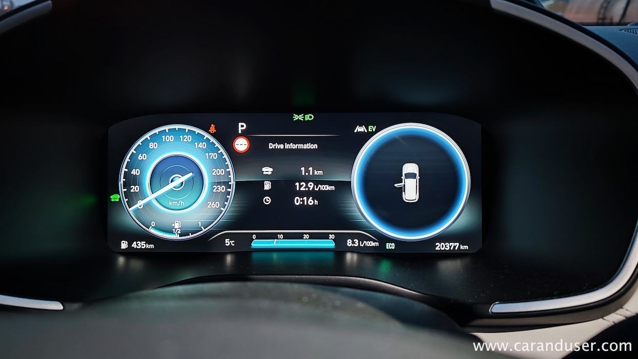 Celotno debato je ob vkrcanju na korejsko ladjo za trenutek presekal trenutek tišine. Prestižni ambient v belem usnjenem oblazinjenju in z lebdečo osrednjo konzolo spominja na potovanje v poslovnem razredu, le mična hostesa je še manjkala, da bi dopolnila prihod gostov. Prostora za vse več kot dovolj, pritisk na gumb menjalnika v Drive in že smo dvignili sidro. Vsled hibridnega pogona je zagon in začetek vožnje prvenstveno električen in neslišen, le v kolikor je baterija izpraznjena se motor tudi na mestu zažene. Odlična zvočna zatesnjenost in lična svetlobna kulisa v zimskem večeru so poskrbele za mirno pot na cilj.