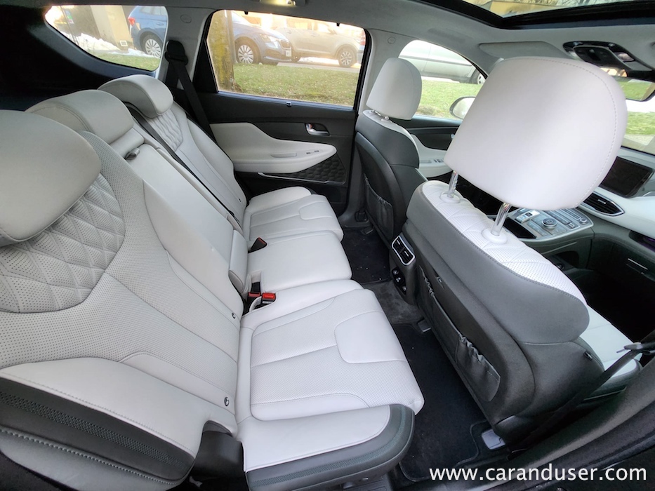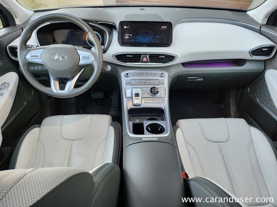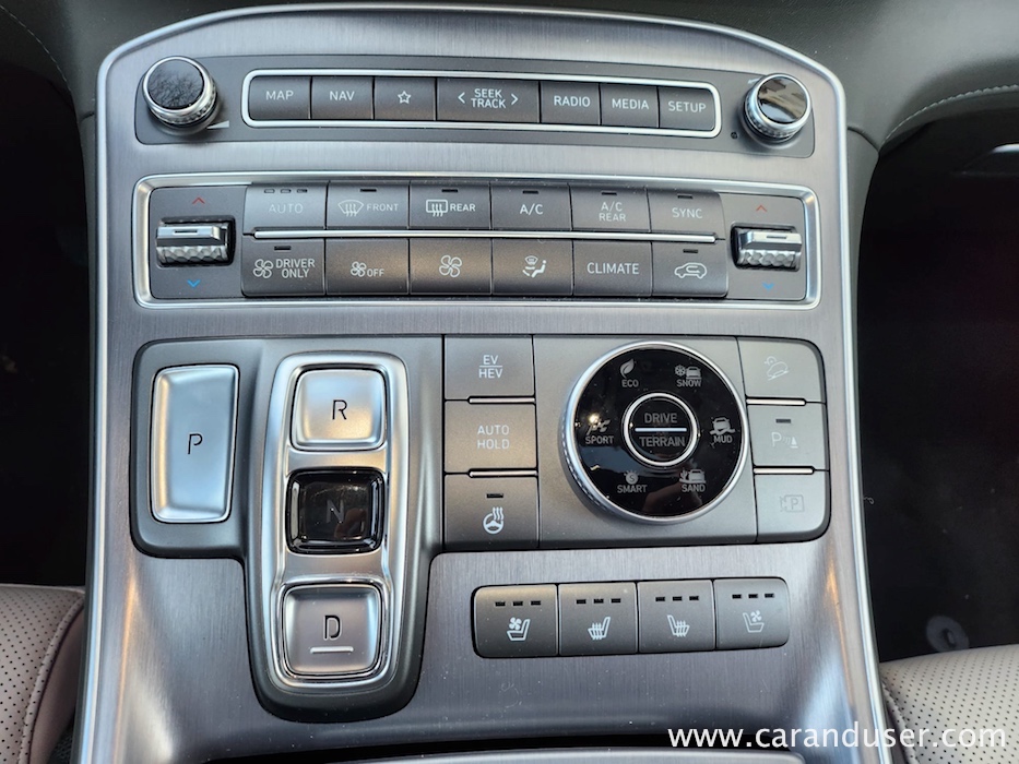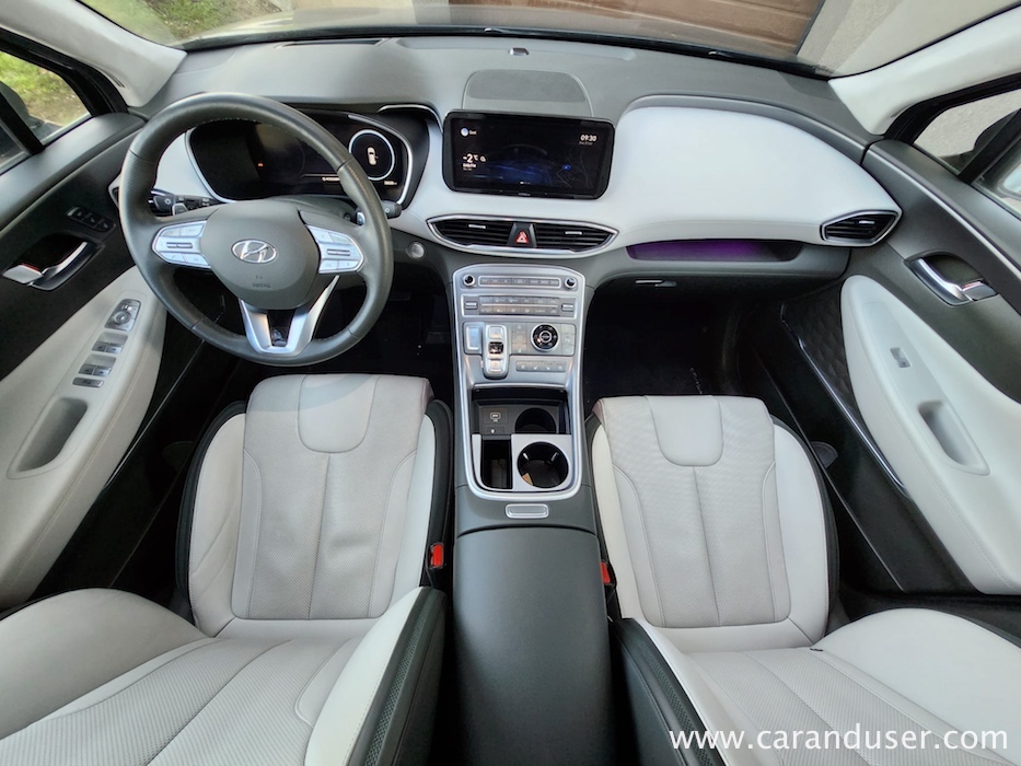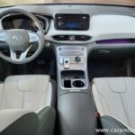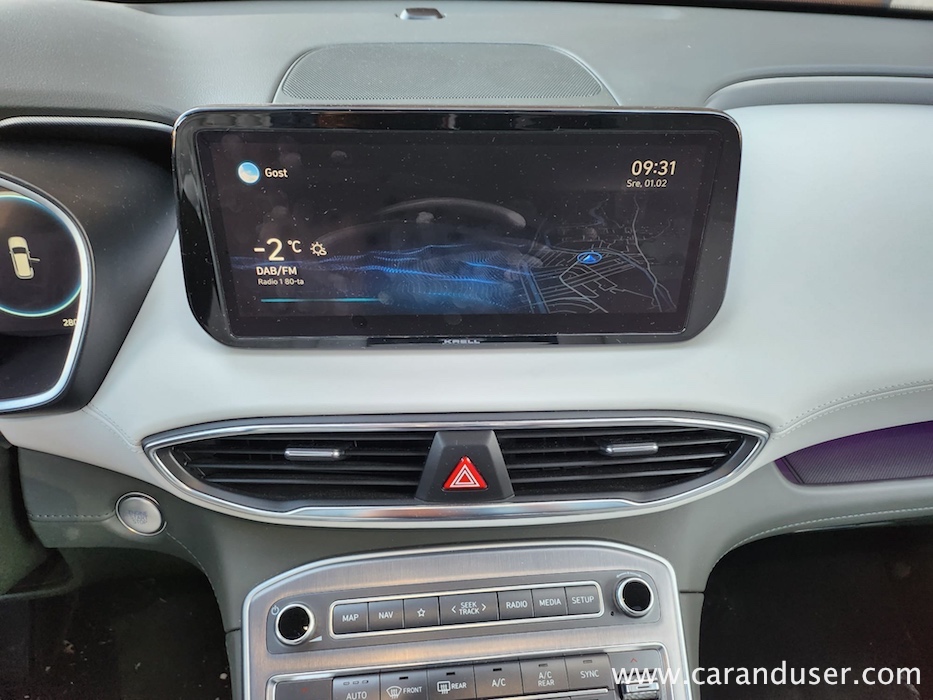 Santa Fe je velik terenec, katerega čar se skriva v njegovih nedrjih. Testnež lahko peterico ali celo sedmero potencialnih potnikov razvaja z obilico prostora, ki ga je dodatno osvetljevala zajetna pomična panoramska streha. Druga sedežna vrsta je bila vzdolžno nastavljiva, medtem ko se je izza nje ob pospravljenih tretji sedežni vrsti bohotil kar 634 litrov zajeten nahrbtnik. Več kot dovolj za 99 odstotkov družinskih migracij, za tiste sezonske »selitvene« pa naj poskrbi strešni kovček. Ko odprete duri tega korejskega velikana se vam razpre udobje belega usnja, kot ponedeljek dolg seznam dodatne opreme ter nenazadnje meni osebno precej všečen komandni »pult« oziroma lebdeča osrednja konzola, kot temu pravijo uradni katalogi. Na njej preko pritiska enega gumba (namesto brskanja po digitalnem ekranu in ducatu podmenijev) nadzorujete Santa Fejev ambient, gretje oz. hlajenje sedežev, delovanje pametnega 4×4 pogona ter parkirne pripomočke. Skratka vse vsakodnevno uporabne funkcije, brez enega samega dotika ekrana. Kako »old school« in kako to prija. Da ne zaidemo predaleč, se moram takojci vsaj mičkeno digitalizirati z nekdanjo reklamno frazo »zvok in slika, kot se šika« ter pohvaliti odlično grafiko vseh kamer, ki prikazujejo okolico vozila, in dober Krellov audio sistem, ki vas bo zabaval predvsem v električnem načinu vožnje.