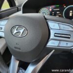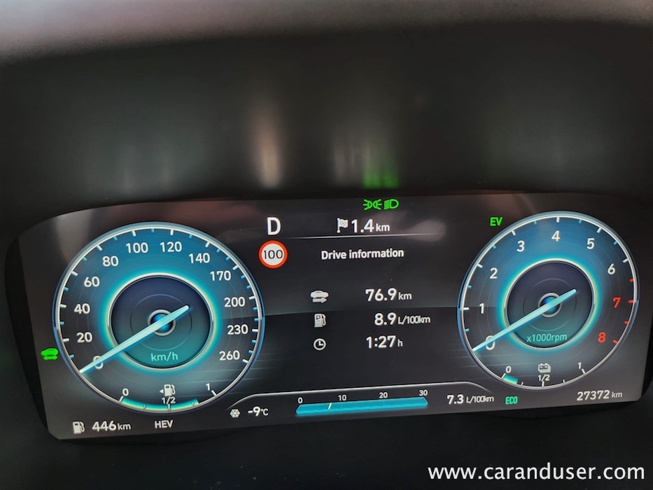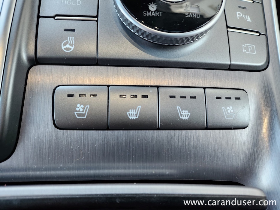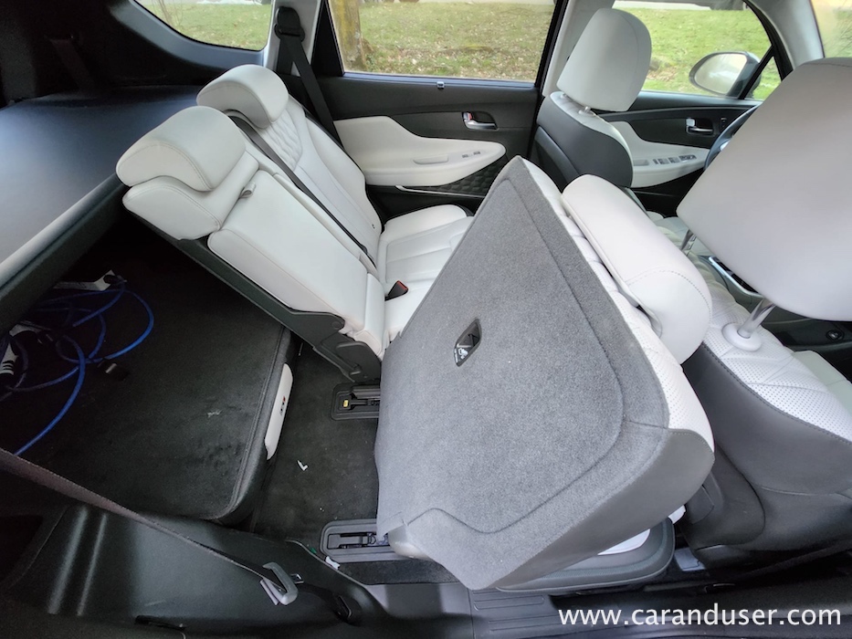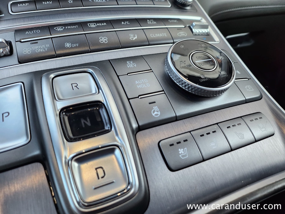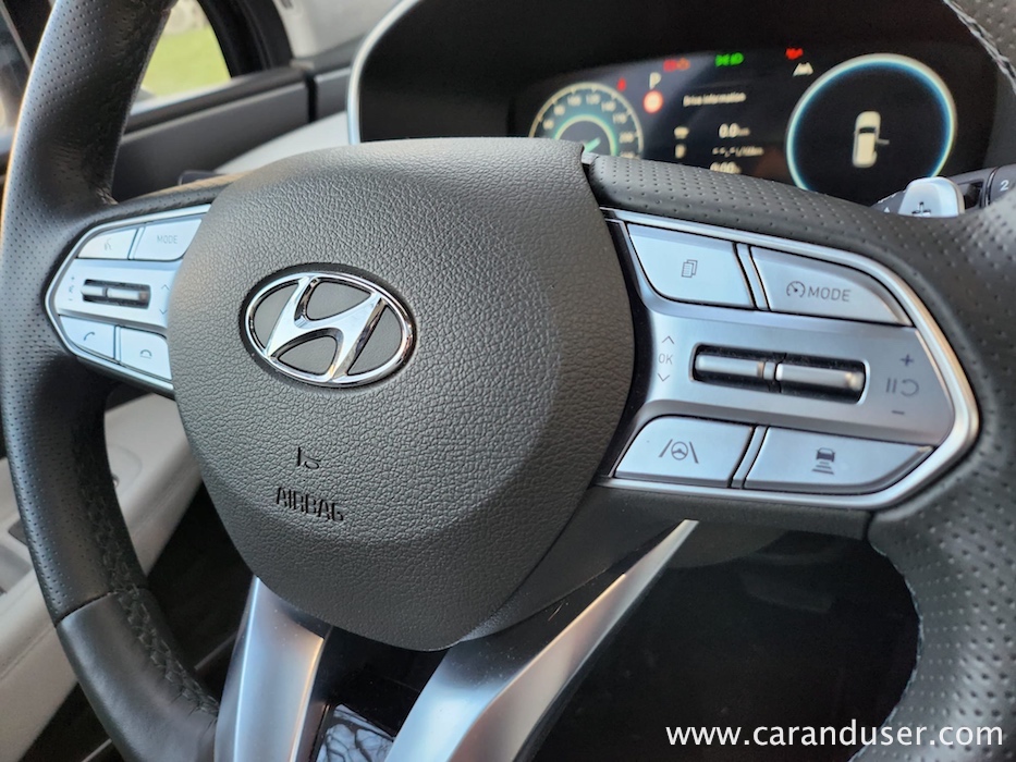 Santa Fe je velik terenec, katerega čar se skriva v njegovih nedrjih. Testnež lahko peterico ali celo sedmero potencialnih potnikov razvaja z obilico prostora, ki ga je dodatno osvetljevala zajetna pomična panoramska streha. Druga sedežna vrsta je bila vzdolžno nastavljiva, medtem ko se je izza nje ob pospravljenih tretji sedežni vrsti bohotil kar 634 litrov zajeten nahrbtnik. Več kot dovolj za 99 odstotkov družinskih migracij, za tiste sezonske »selitvene« pa naj poskrbi strešni kovček. Ko odprete duri tega korejskega velikana se vam razpre udobje belega usnja, kot ponedeljek dolg seznam dodatne opreme ter nenazadnje meni osebno precej všečen komandni »pult« oziroma lebdeča osrednja konzola, kot temu pravijo uradni katalogi. Na njej preko pritiska enega gumba (namesto brskanja po digitalnem ekranu in ducatu podmenijev) nadzorujete Santa Fejev ambient, gretje oz. hlajenje sedežev, delovanje pametnega 4×4 pogona ter parkirne pripomočke. Skratka vse vsakodnevno uporabne funkcije, brez enega samega dotika ekrana. Kako »old school« in kako to prija. Da ne zaidemo predaleč, se moram takojci vsaj mičkeno digitalizirati z nekdanjo reklamno frazo »zvok in slika, kot se šika« ter pohvaliti odlično grafiko vseh kamer, ki prikazujejo okolico vozila, in dober Krellov audio sistem, ki vas bo zabaval predvsem v električnem načinu vožnje.