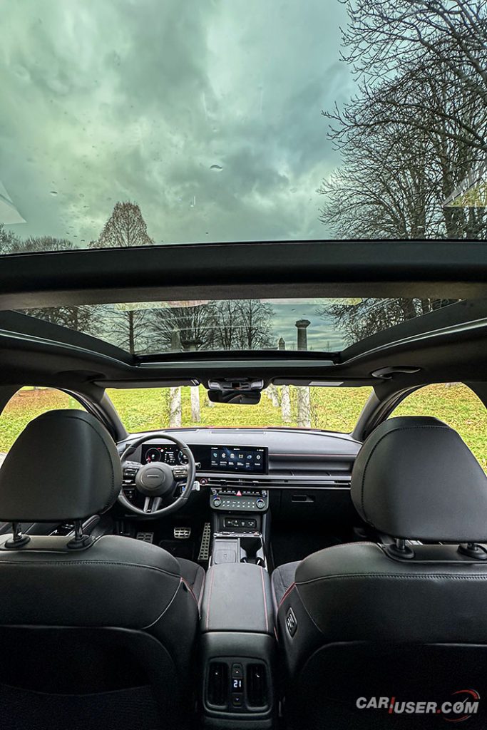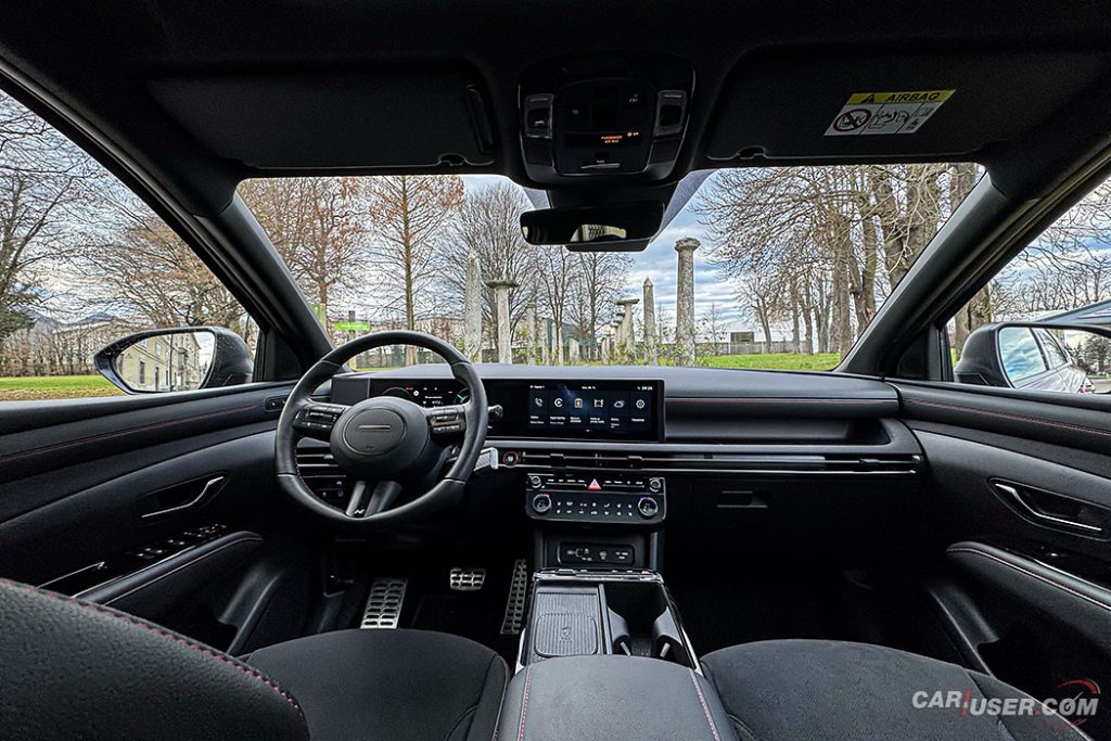 Ko je že govora o info-zabavnem sistemu, naj zaupam, da le-ta sedaj, podobno kot pri Koni, domuje znotraj ukrivljene panoramske enote, v katero sta skrita dva 12,3-palčna visoko resolucijska zaslona na katerih boste našli vse potrebne informacije. Levi zaslon je namenjen prikazu merilnikov, desni pa je občutljiv na dotik in je namenjen navigacijsko-zabavnim vsebinam. Kot je sedaj že skoraj običajno, info-zabavni sistem podpira brezžično povezljivost s sistemoma Android Auto in Apple Carplay, v testnem primerku pa je omogočal tudi povezljivost na daljavo prek sistema Blue Link in uporabo digitalnega ključa.