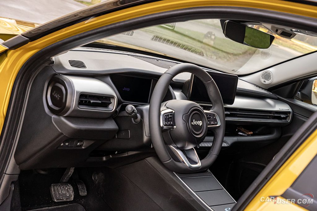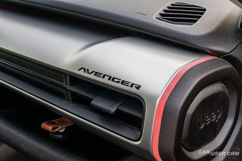 Tudi v notranjosti je zgodba podobna. Všečne prečiščene oblike, volan z velikim Jeep logotipom, zanimiva postavitev tipk za izbiro prestave in dobra ergonomija, so glavni aduti Avengerja. Zanimiva in nadvse uporabna je tudi možnost personalizacije pogledov števcev in info zabavnega zaslona ter pokrov vmesnega predala v slogu tabličnih računalnikov pod katero se skrivajo USB priključki in brezžični polnilec za pametne telefone. Da bo telefon varno počival na polnilcu skrbi možnost brezžične povezave Apple CarPlay in Android Auto, za zvočno kuliso skrbijo JBL zvočniki z dodatnim nizkotoncem zadaj.