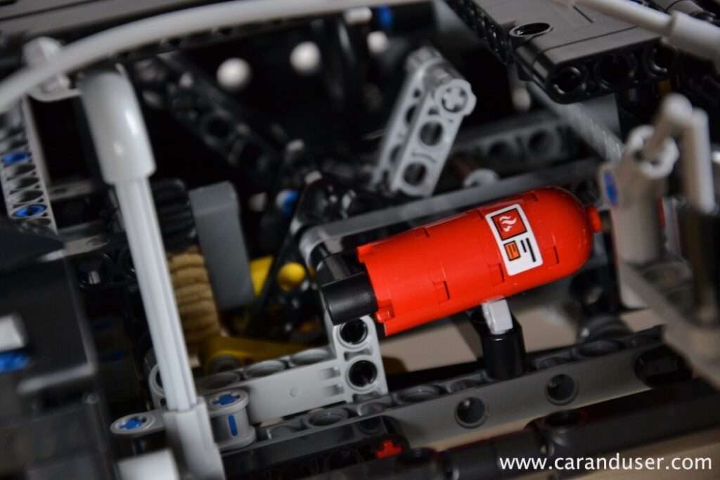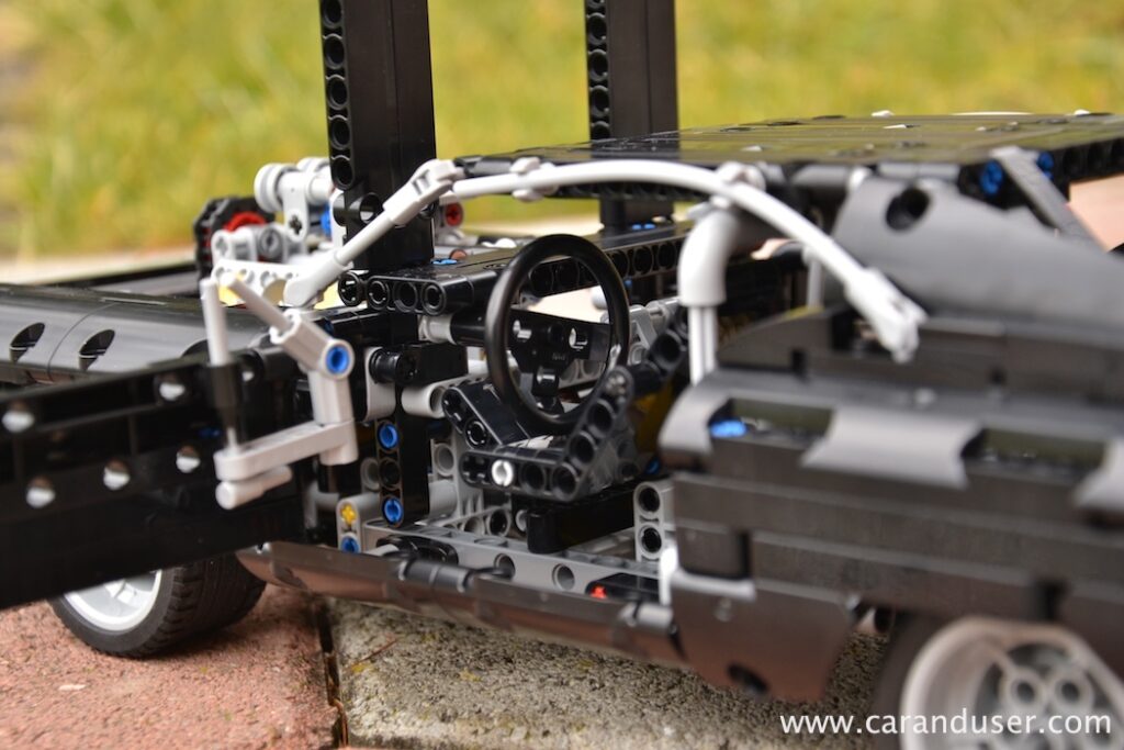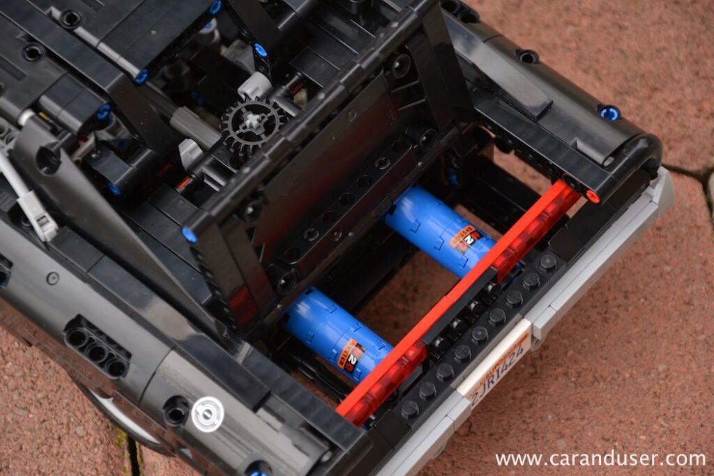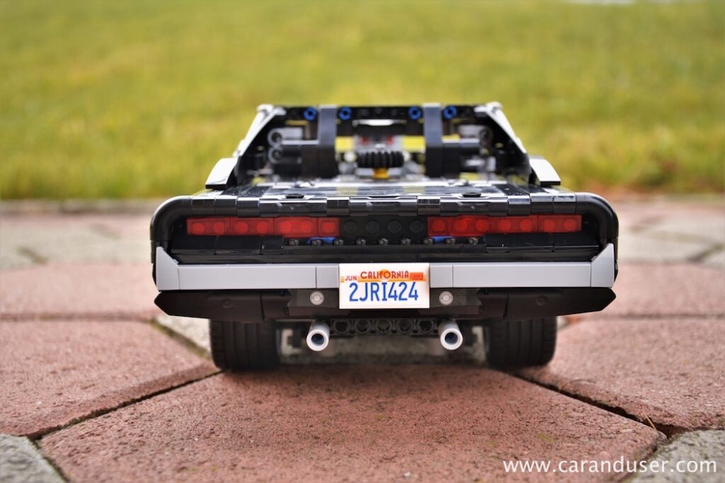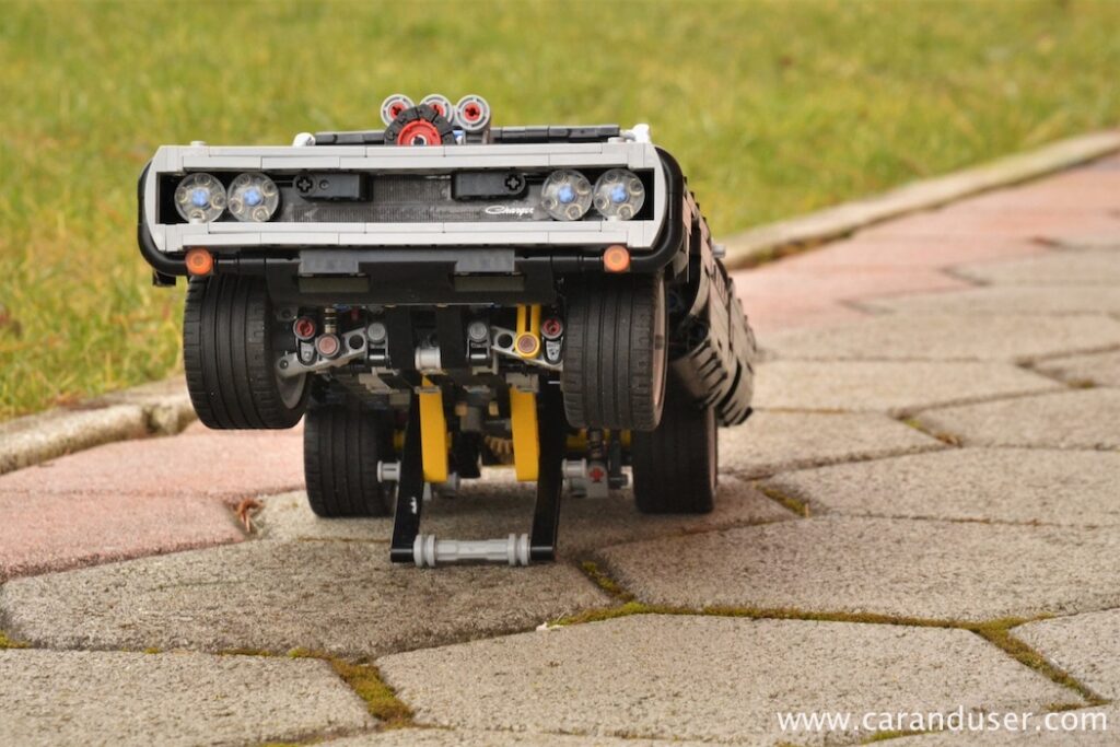 Nastopi gradnja, v mojih očeh, najbolj markantnih delov vozila. Sprednja maska ter zadek. V teh pogledih avtomobil deluje najbolj avtentično, medtem ko je bočna linija precej medla (beri, lahko bi jo zamenjal za katerikoli drug ameriški avtomobil iz tega obdobja). A to je slabša plat Technic serije, kjer je poudarek na delovanju izbranih komponent. V sklopu zaključevanja gradnje se v odpirajoči se prtljažnik namestijo dve jeklenki N20, na sovoznikovo mesto pa gasilni aparat. Seveda ne manjka krmiljenje sprednjih koles, ki se opravlja preko vrtljivega vzvoda za zadnjim ‘steklom’. Kar preostane je uprizoritev dejanja iz filma, ko aktiviramo stojalo in Dodgea postavimo na zadnji kolesi.