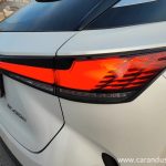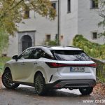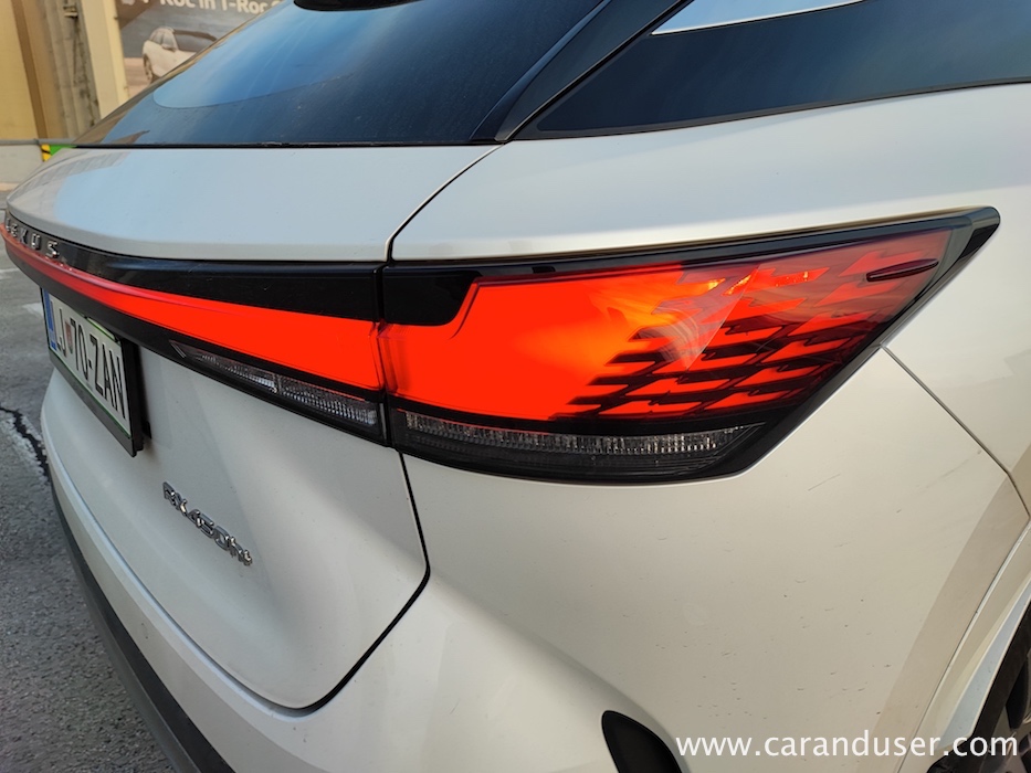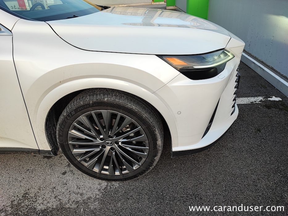 Oblikovalci so ostrino minule generacije nadgradili z malenkost daljšo medosno razdaljo in daljšim pokrovom motorja, vse skupaj zapakirali v t.i. vretenasto karoserijo in jo povsem v svojem japonsko-zadržanem slogu oplemenitili s trojnimi LED žarometi in res zajetnimi 21-palčnimi platišči. Rezultat je izredno zanimiva in vpadljiva dinamična podoba družinskega SUV-ja, ki v nasprotju s tezo iz prejšnje povedi krade poglede na in ob cesti – vedno in povsod. Maska vozila z nekoliko manjšim, a še vedno zajetnim vstopom hladilnega zraka izraža visoko stopnjo samozavesti, ki voznike na avtocesti avtomatsko sili na umik iz prehitevalnega pasu, čeprav RX, za razliko od germanskih konkurentov, ni in ne želi biti športnik.