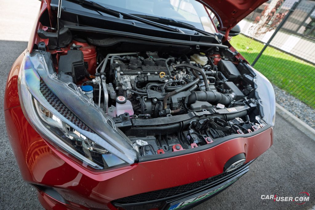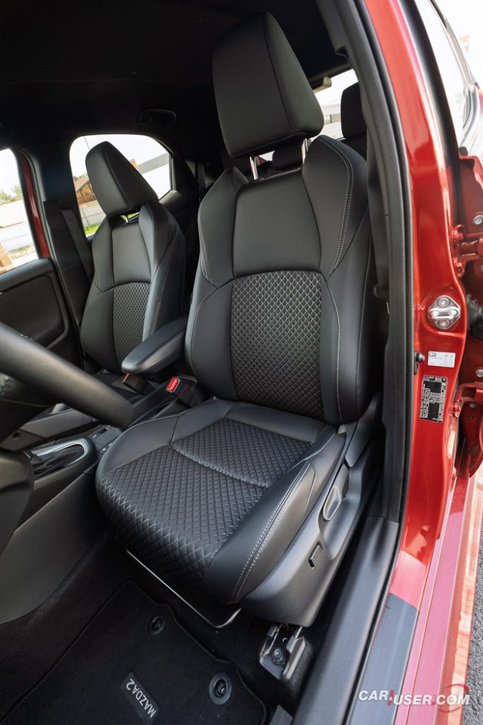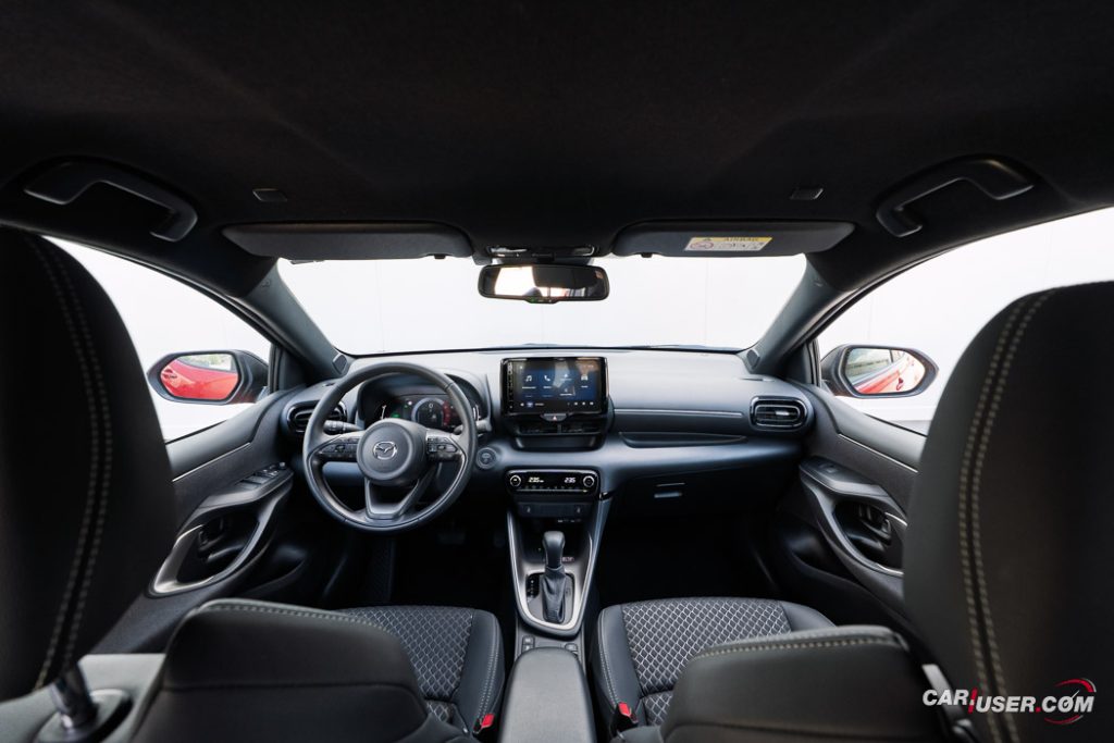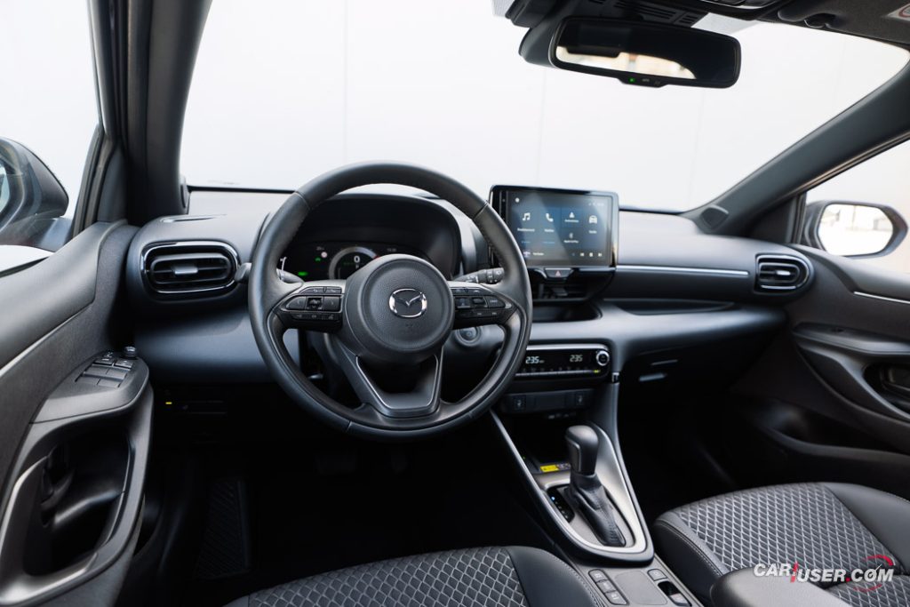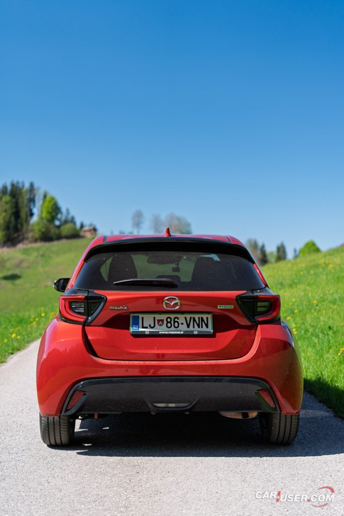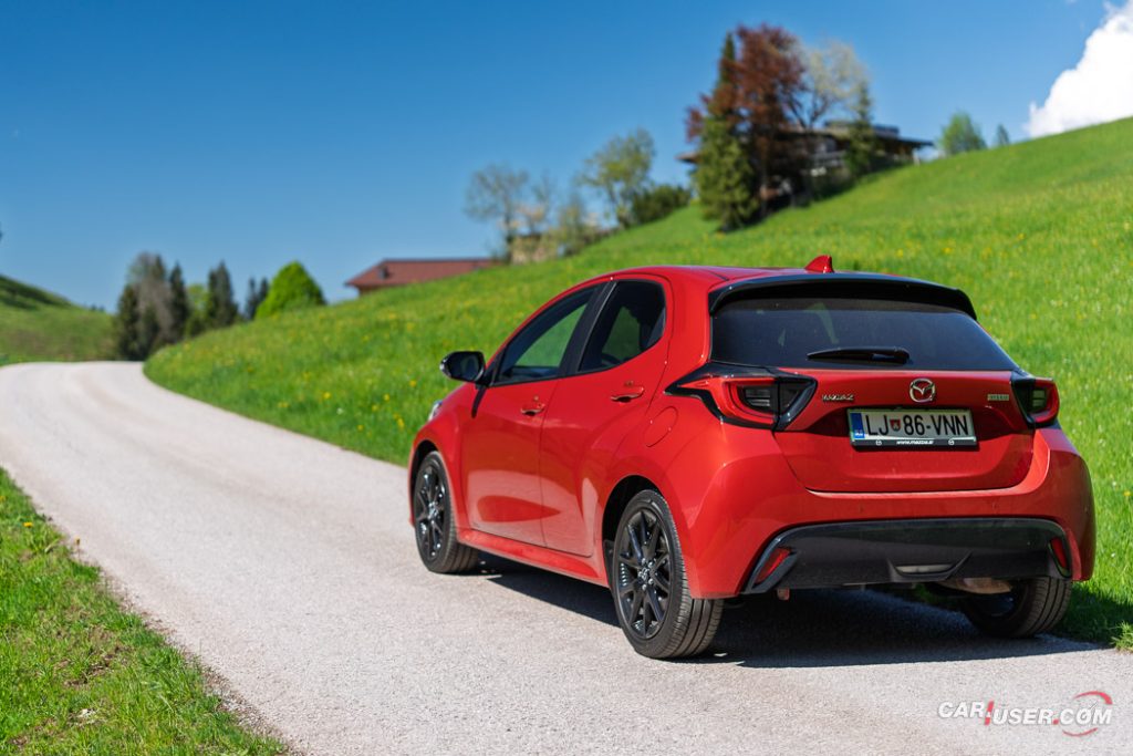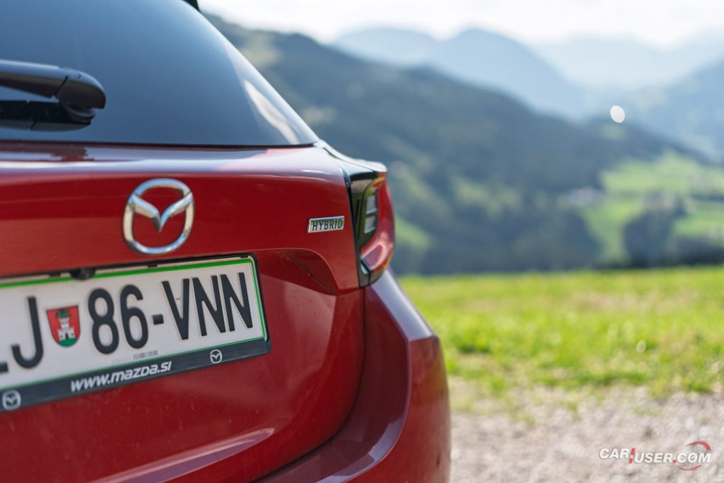 Potem pa je tu še pogon. Tega sestavljajo tri-valjni bencinski motor s prostornino poldrugega litra, ki mu izdatno pomaga elektromotor in pa brezstopenjski CVT menjalnik. Že po podatkih na papirju gre slutiti, da Mazda ni športnica, pri čemer 116 konjičev in 120 Nm navora niso podatki ob katerih bi se vam naježila koža, a kljub temu je zaradi izdatne električne pomoči precej agilna med mestnimi semaforji. Kar me je med testom presenetilo, je bil čas, ki ga je »dvojka« prevozila zgolj na elektriko, saj je ta znašal več kot polovico (53 %) časa vožnje.