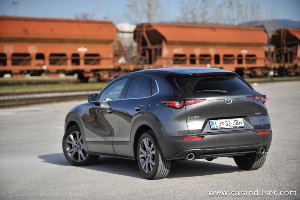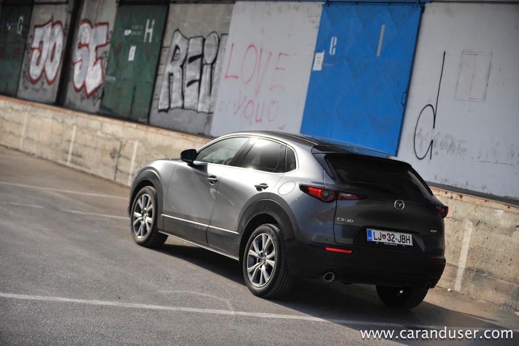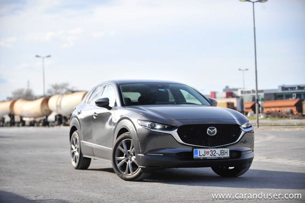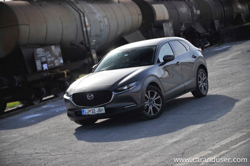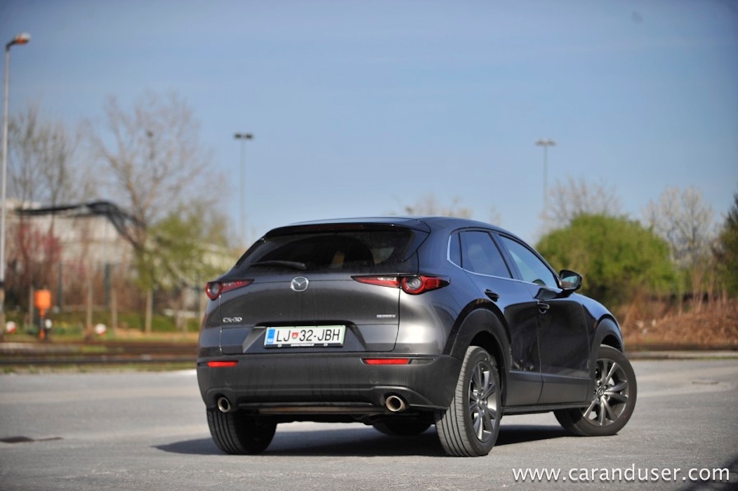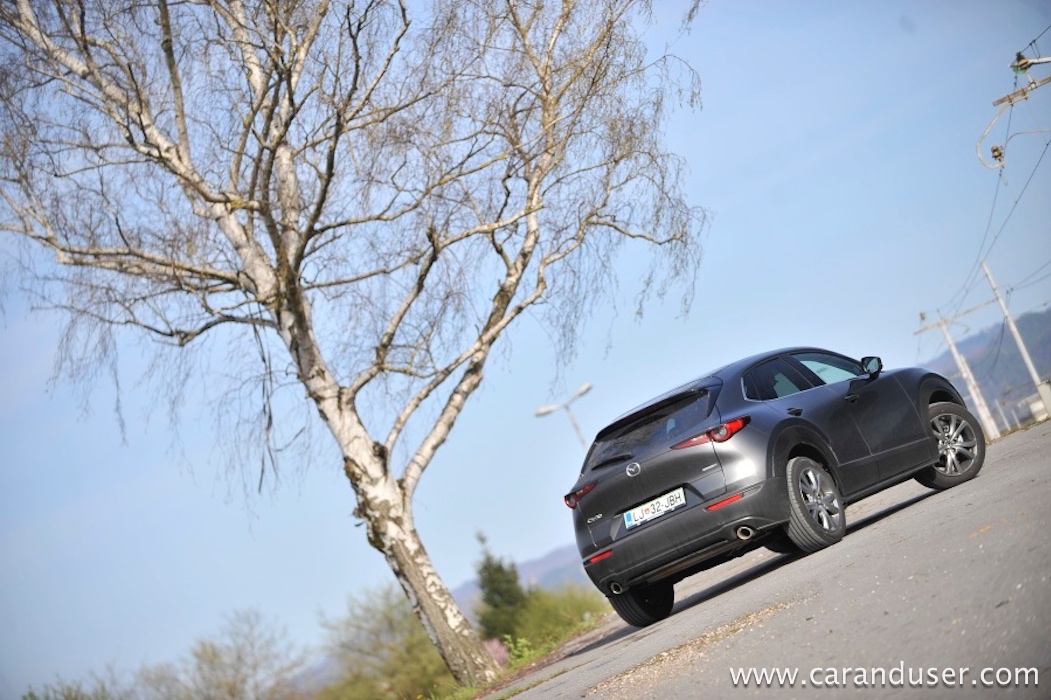 Pogon je ob že omenjenem tehnično začinjenem agregatu dodatno obogaten še s tehnologijo priključnega hibrida, ki je v praksi voznik ne občuti. Gre za sodobno kombinacijo, ki jo tvorita dvolitrski atmosferski agregat z nadzorovanim kompresijskim vžigom (kljub oktanski mešanici v valjih) in alternator-generator z mini baterijskim sklopom. Pretakanje energije lahko spremljate na osrednjem zaslonu, bolj kot poskočnost 186-glave konjenice pa pričakujte izredno tih in uglajen pohod po asfaltiranih poteh. Da bo veselje še večje poskrbi odličen ročni menjalnik s kratkimi in natančnimi hodi. Po drugi strani takšna zvrst pogona deluje lenobno, saj ni tiste brce v nizkih vrtljajih, ki jo navadno priskrbi prisilno polnjenje, zato pa pričakujte nekaj več pokončnih kocin ob visokih vrtljajih. Kljub bontonu se motor rad zavrti proti rdečemu polju in iz izpušnih cevi se sliši nekaj zamolkle simfonije, ki spominja na »dobre stare čase«. Povprečna poraba se vrti med šestimi in sedmimi litri in leze preko sedmice zgolj in le v urbanih naseljih, skok proti osmici pa se zgodi ob voznikovem nasmehu med hitrimi zavoji, katere CX-30 in njeno podvozje z lahkotnostjo odpravita. Zdi se, da videz in stabilnost vozila kar kličeta bo zajetnejši konjenici pod motornim pokrovom, ki pa je (žal) ne bosta dočakala.