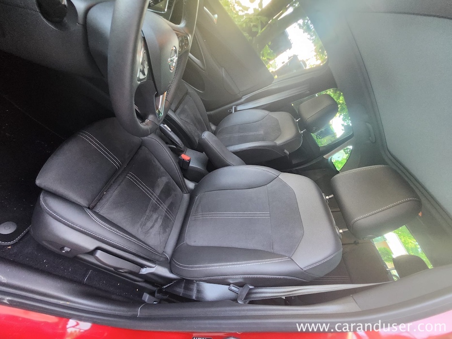 Opel Crossland med drugim prinaša 17-palčna bleščeče črna lita platišča, adaptivne LED žaromete ter dvobarvno kombinacijo streha-karoserija. Skratka, Oplov križanec je pridobil na slogu in je med vožnjo videti elegantnejši kot je bil pred združitvijo podjetja s skupino PSA. Da se tudi ambient vozila sklada z dinamično zunanjostjo poskrbi oblazinjenje iz alkantare (to verjetno ni najbolj smela izbira, če boste redno prevažali vaše kosmatince) ter kopica rdečih dodatkov, ki lično presekajo pretežno v črnino odeta nedrja Crosslanda.