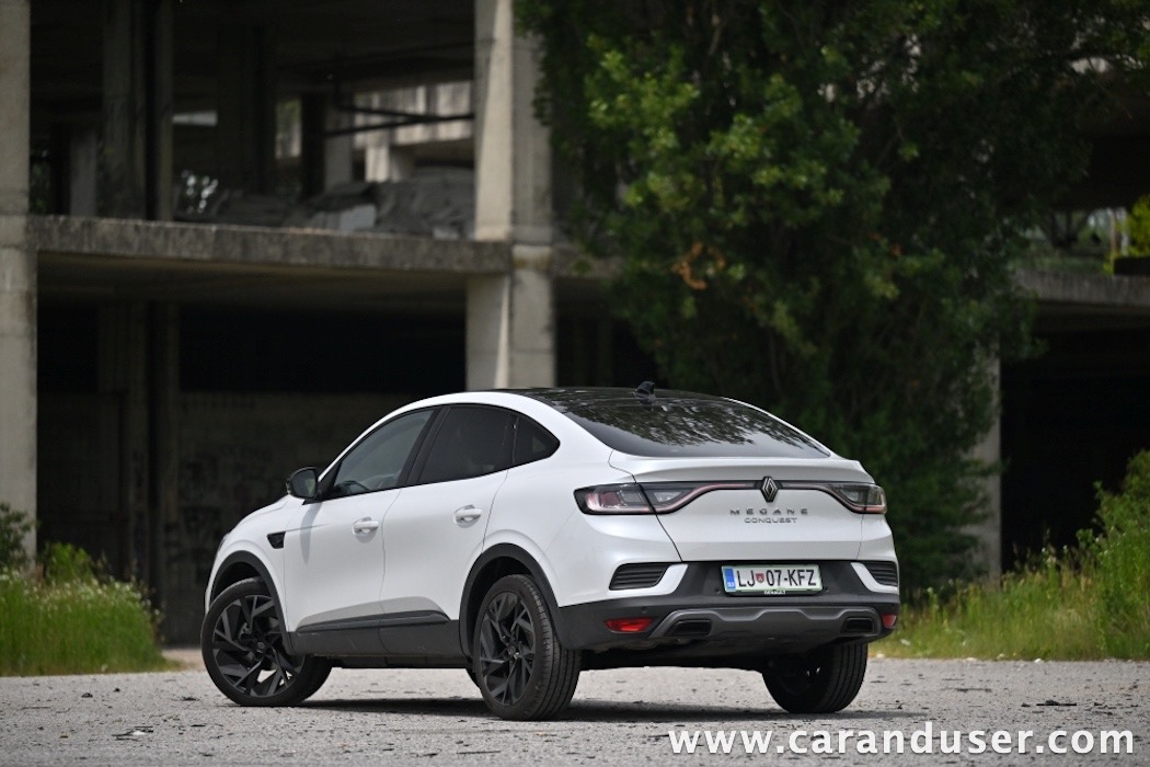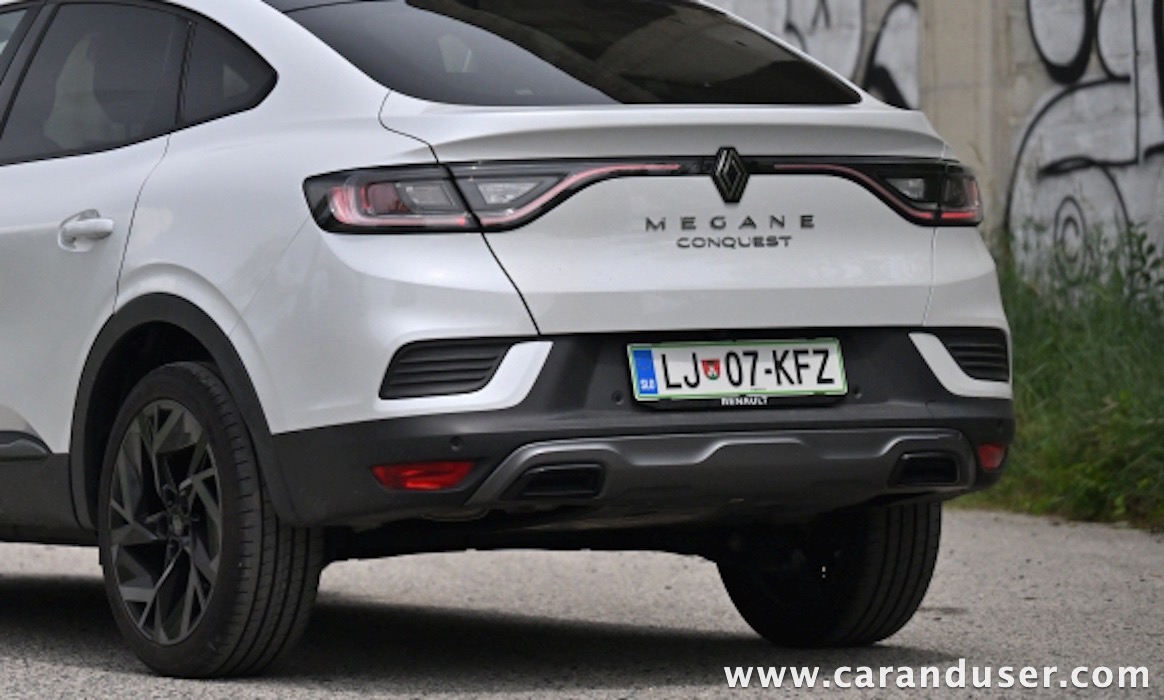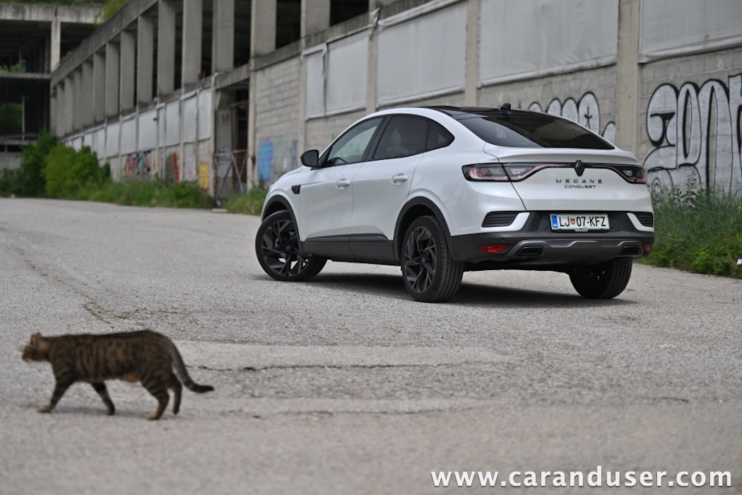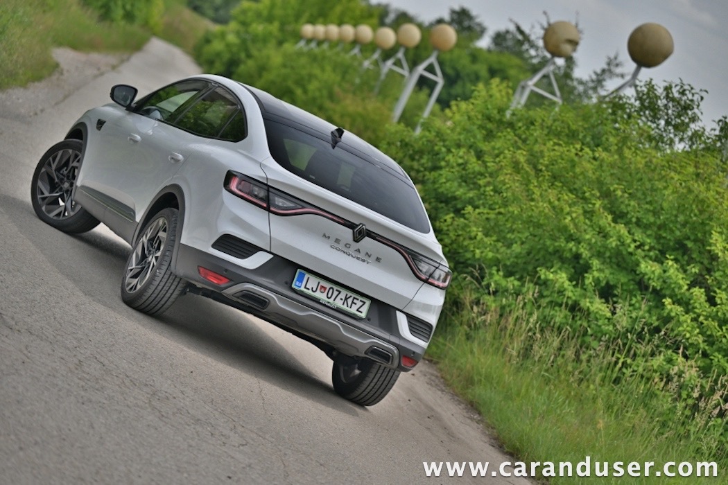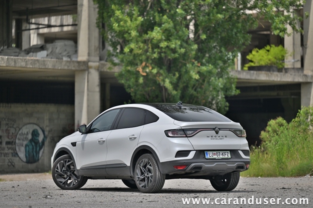 Megane Conquest si namreč lasti pregovorno mehko francosko podvozje in je prednostno posvečen šarmiranju ter manj akciji. Ob rahlem cestnem nastopaštvu v ospredje stopi njegova mini hibridna plat, ki privarčuje kak deci ali dva oktanskega napoja, predvsem ko samozavestno jadrate med semaforji mestnih vpadnic. Seveda se lahko kupjevski križanec zapodi tudi skozi hitre zavoje, vendar kaj kmalu opozori voznika, da voz stopa iz cone udobja. Bolj kot ovinkarjenje mu ležijo dolge podeželske ali avtocestne ravnine, tudi v družinski izvedbi. Kljub kupejevski liniji njegov nahrbtnik namreč pogoltne do 513 litrov prtljage, kar bo zadostilo 99% potreb, za tiste sezonske selitvene aktivnosti pa boste nanj nadeli strešni kovček. Zadnje duri se odpirajo visoko zato težav z dostopnostjo ne bo.