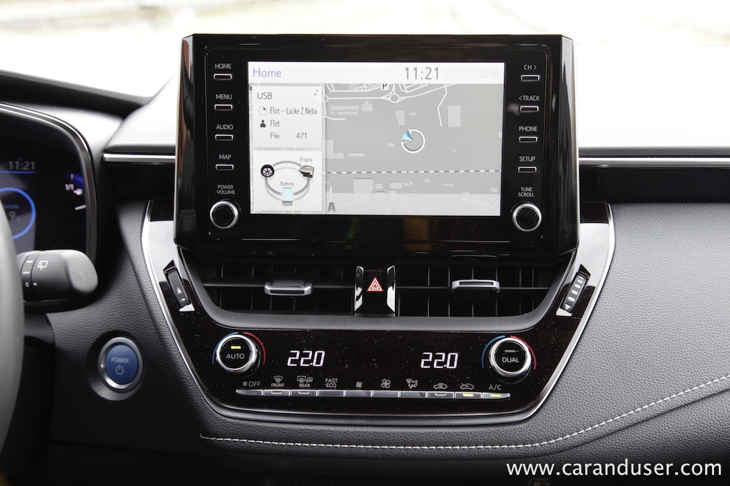 Kaj pa elektronska oprema športne Corolle? Sam ambient deluje precej sodobno, vendar prav nič kompleksno. Stvari so postavljene in zamišljene logično, edino Toyotinega multimedijskega vmesnika se morate nekoliko privaditi saj odstopa od uveljavljenih evropskih struktur. V nekaj dneh ga osvojite kot nov mobilni telefon pri katerem se prvi dan uporabe počutite »goli v sedlu«, čez dva dni pa že galopirate.